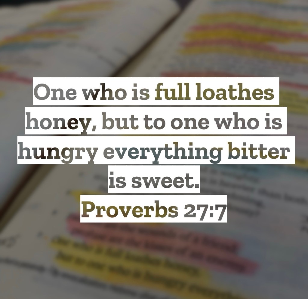 One who is full loathes honey, but to one who is hungry everything bitter is sweet. Proverbs 27:7 – Likely we all know it’s a bad idea to go to the grocery store when you’re hungry. Your shopping cart will find itself full of more items than you need all because everything looks tasty to you when you’re hungry! This is the idea of this verse, while honey is sweet at all times, someone who is filled has no desire even for the sweetness of honey. Yet the person who is hungry, anything, even bitter foods sound good to them. On a practical level this makes sense, yet can we see how this resonates with our spiritual life? Jesus is sweeter than honey, always He and what He offers is good and sweet. Yet if we are full of things of this world, even the sweetness that Jesus offers doesn’t sounds good to us. We’ve satisfied our desires with sinful things that we reject the honey, the good things of Jesus. When though we haven’t feed ourselves on the world and all its sinfulness, we have room in our life for what Jesus offers. We are hungry for what He gives, even if sometimes what He gives is hard and difficult, we still long for it because we know what He gives is good for us. Are you then hungry for spiritual things? Do you desire time with Jesus and time with His people? Or are you “full,” not hungry at all for spiritual things and content with where you’re at? Know a heart that is satisfied with this world and has no longing for spiritual things is one that has filled itself with sin. Empty that life of sin, and find a hunger for the sweet honey that Jesus offers. I love you, but Jesus loves you more – Mac – Daily DEVO 2935