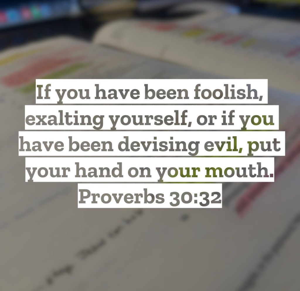 If you have been foolish, exalting yourself, or if you have been devising evil, put your hand on your mouth. Proverbs 30:32 – Chapter 30 is written by a different writer than King Solomon, a man named Agur. Outside of this chapter he is not spoken of elsewhere in scripture, so we don’t know anything else about him other than the collectors of the proverbs deemed him a wise man. We see in one of his final verses a simple, yet oh so powerful, nugget of wisdom being given. If someone had been foolish, if they had been prideful and boasting about themselves, if they had been devising evil, if they had been doing all the things Proverbs up to this point had been directing people not to do…they should stop. Put your hand over your mouth, stop talking, and stop behaving in such a way. A very simple direction, yet life changing if followed. My desire is that people today acknowledge and recognize this can be their story to. Yes, they may have been foolish, prideful, evil, and doing everything scripture says not to do. That though doesn’t have to be their forever story, they can stop. Jesus is able to free us from the bonds of sin and the grip of Satan. He can break addictions, and He can change hearts. With Jesus’ help you can stop. Maybe that’s a message you needed to hear today spoken over your struggle with sin. Stopping is possible with Jesus. Freedom is possible with Jesus. Confess this sin to the Lord, bring the brothers and sisters of Christ that God has given you into this struggle, and lean daily on His help. God can help you put your hand on your mouth. God is able to help you stop; embrace His help. I love you, but Jesus loves you more – Mac – Daily DEVO 2938