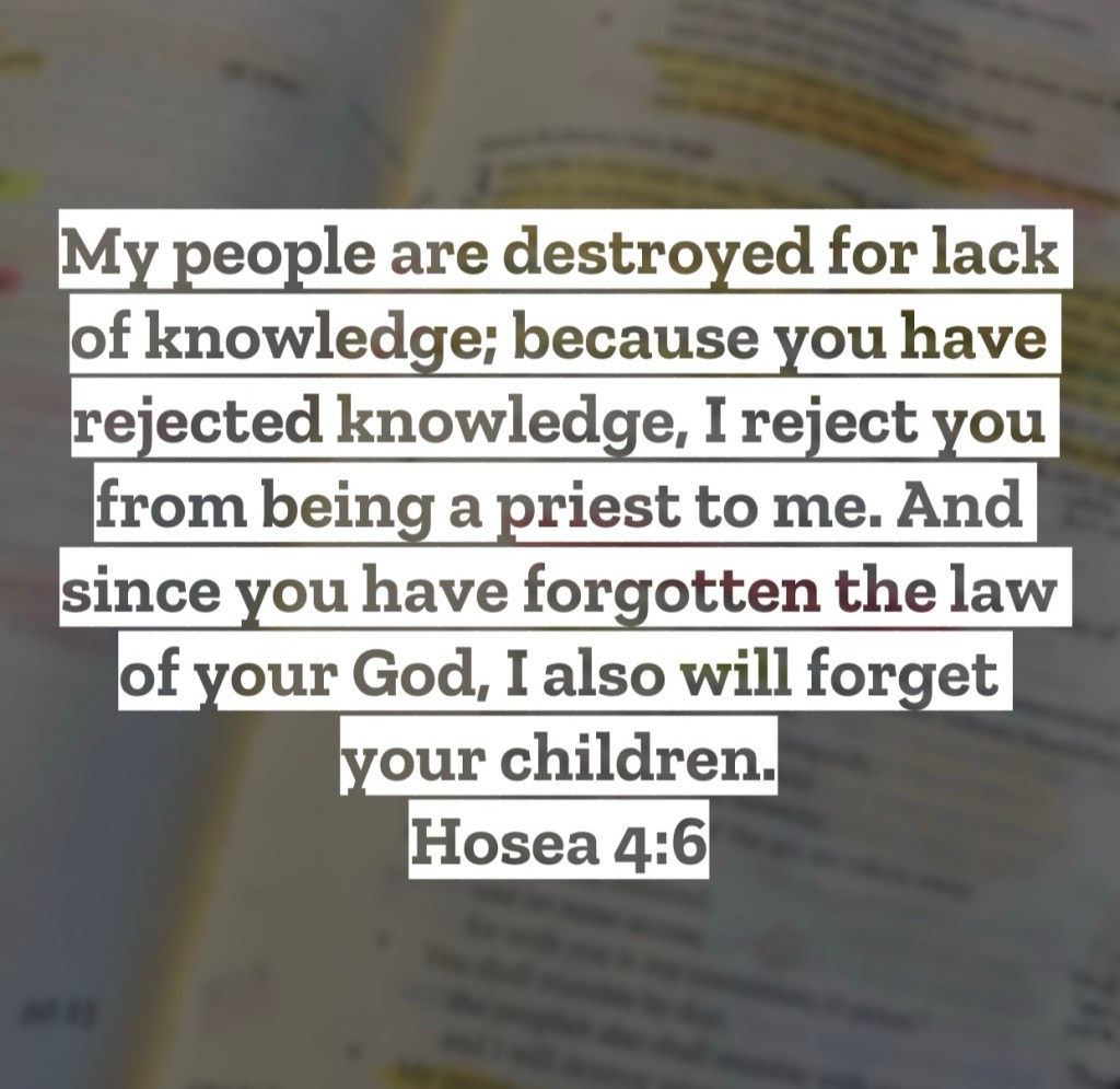 My people are destroyed for lack of knowledge; because you have rejected knowledge, I reject you from being a priest to me. And since you have forgotten the law of your God, I also will forget your children. Hosea 4:6 – Starting in chapter 4 the whole visual example of Hosea and his adulterous wife is set aside and God begins to speak plainly about the state of Israel. The nation had fallen deep into sin, they had broken all restraints, and they were diving head first into all sorts of sin and worship of false gods. In verse six we learn a primary reason the people of Israel lacked the knowledge of God’s word which caused them to stray so heavily. The priests, the ones who were supposed to be teaching God’s word to God’s people, had themselves chosen to reject God’s word and were not teaching it to the people. When the teachers of God’s word don’t teach God’s word, God’s people stray to sin. While this sort of passage is certainly directed at me as a preacher, know if you are a Christian, this passage is speaking to you as well. Every follower of Jesus is to be a proclaimer of His Word. We are to share His word to our fellow believers to help them grow, and we are to share God’s word with non-Christians to help them know of God’s salvation. So when we look at the state of the world we are in now, would we say the world knows God and knows God’s word properly? Sadly no, and that’s on all of us believers. Today, however you can and with whoever you can, start sharing the truth of God’s word and make His word known to everyone. Let lack of knowledge of God’s word not be the case for the people that God has put in your reach. I love you, but Jesus loves you more – Mac – Daily DEVO 2943