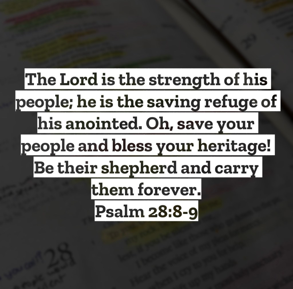 The Lord is the strength of his people; he is the saving refuge of his anointed. Oh, save your people and bless your heritage! Be their shepherd and carry them forever. Psalm 28:8-9 – As we begin this psalm, the nature of David’s words are more of the crying out for help type rather than the praising that we see in the later part of the psalm. He is in trouble and his voice is being lifted to the Lord asking for help. He refuses to be counted among the wicked and to face the same end as they will, but he knows that if the Lord doesn’t move in his life, he’ll experience the same end as the wicked he longed to be far from. Thankfully we see the Lord hear and respond to David’s plea, and at the end of the psalm David proclaims a beautiful truth that the people of God need to latch onto. The Lord is the strength of His people, and the Lord is the saving refuge. Note that not only does the Lord provide things like strength and refuge, but He IS both things for His people. He is the Shepherd that saves, blesses, and carries His people forever. Why this truth is something believers today need to latch onto is because often our prayers can be a long list of requests from the Lord. “Lord please give me ____,” or, “God, I really need you to bring ____ into my life.” While such requests aren’t wrong, let us remember it’s the Lord we need, for He IS what we need. He is the love, refuge, help, and strength we need right now. He is the shepherd, protector, and Father we need right now. Let our prayers then reflect our understanding of this truth, that over and above all other requests, we simply ask for more of the Lord in our life. For when we have Him in our life, we have everything we need. I love you, but Jesus loves you more – Mac – Daily DEVO 2983