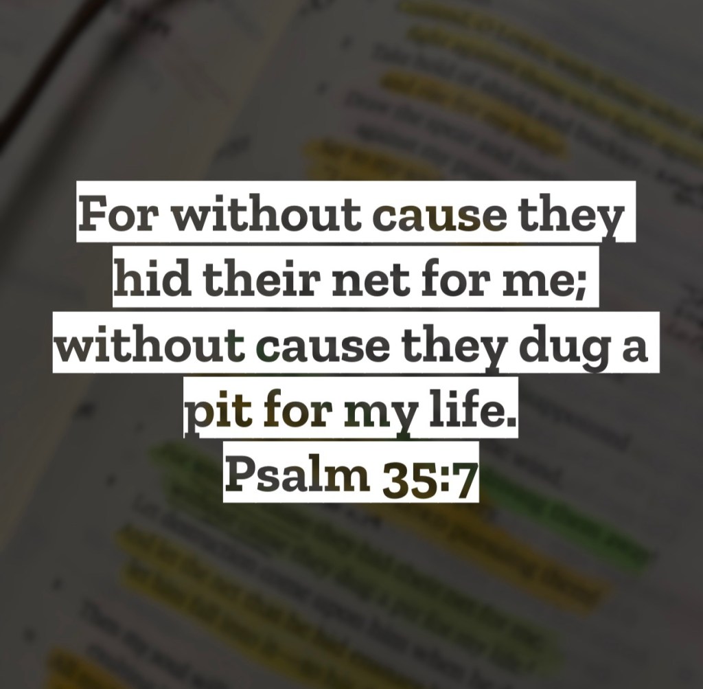 For without cause they hid their net for me; without cause they dug a pit for my life. Psalm 35:7 – I learned today that this sort of psalm is called an “Imprecatory” psalm, which means it’s a psalm where the writer is pleading for God to defeat the enemies of His people. David clearly is pleading for this to take place in this psalm, enemies are fighting against him and tearing at him like he was a piece of meat at a feast. Twice in our verse above we also learn that this evil was coming against him “without cause.” We see that idea again in verse 19 when it says, “who hate me without cause.” This violence towards David wasn’t because of David’s sinfulness or evil towards the attackers, it was fueled by some other reason that David had no hand in creating. When uninvited evil like this comes our way without cause, we to can find ourselves confused like David. Why did they say that about us, or why did they take that from us, or why did they treat us like that…all when we did nothing to invite such evil. Sadly, such may be our story as we follow Jesus in this broken world. Take peace though remembering you aren’t alone in being treated unfairly like this. David himself navigated this, and even Jesus, in John 15:25, refers back to this very psalm saying He too was finding Himself hated without cause. Like David and like Jesus, when hatred is coming our way without cause, find shelter and support in the Father. Cast your cares upon Him for the Lord cares for you. While the evil is uninvited, we can always invite the Lord to be with us in our difficult seasons. I love you, but Jesus loves you more – Mac – Daily DEVO 2990