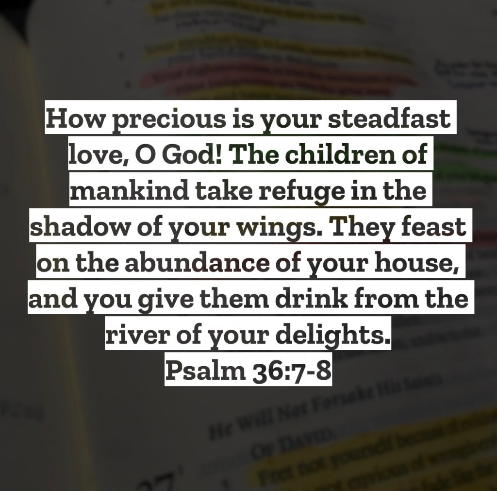How precious is your steadfast love, O God! The children of mankind take refuge in the shadow of your wings. They feast on the abundance of your house, and you give them drink from the river of your delights. Psalm 36:7-8 – Spurgeon shared a story connecting to this psalm…Once a father brought his family into their brand new, much larger home for the first time. His son ran through the house exclaiming in joy, “Is this ours father? And is this ours?” Never once did the son ask, “Is this yours father?” The son found joy in knowing that what the father had was his, and the father found great joy in seeing his son share in what was his. As believers, we too are children of God. One day we’ll be able to enjoy the fullness of God in Heaven, but even on this earth in this life God’s blessing and abundance is present. God’s steadfast love is present with us today. The refuge God provides is available for us today. The feast of God’s blessing and the river of delight is available today for us to partake in. What we see though in this psalm is the contrast between the wicked and the holy. Those still consuming and embracing sinfulness will never taste the goodness of the Lord’s house, but those who set aside their sin find the fullness of God’s blessing. What the Father has is shared with His children. All love, joy, goodness, and mercy is shared with His children. One day we’ll be able to run through the halls of Heaven exclaiming, “Is this ours Father,” but know even today we can walk the halls of this life sharing in God’s abundance when we follow Him. I love you, but Jesus loves you more – Mac – Daily DEVO 2991