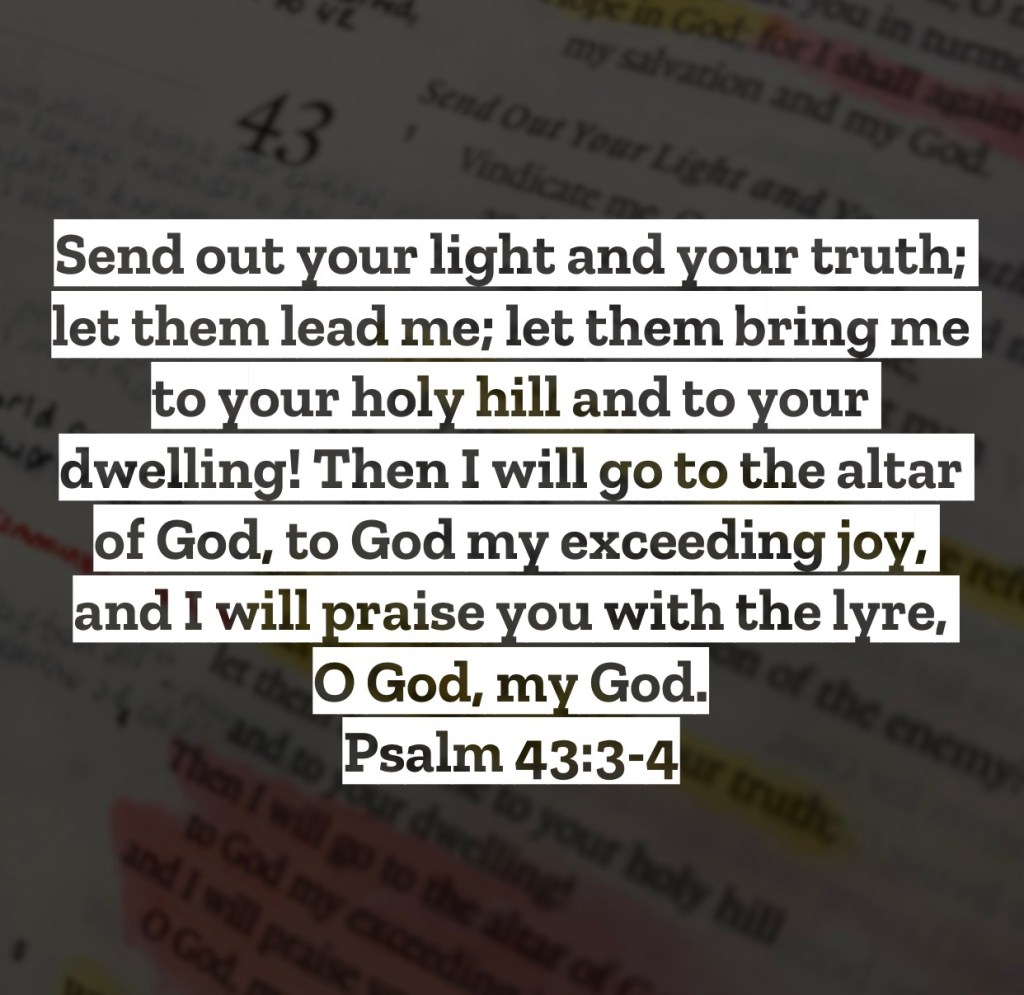 Send out your light and your truth; let them lead me; let them bring me to your holy hill and to your dwelling! Then I will go to the altar of God, to God my exceeding joy, and I will praise you with the lyre, O God, my God. Psalm 43:3-4 – This psalm is an extension of the previous psalm, likely written at a later date to add onto the depths of difficulty found in Psalm 42. Here the psalmist is pleading with the Lord and then sharing what He’ll do once God provides. He asks for God’s light and truth to be sent to him. He needed God’s light to cast out the darkness surrounding him and for God’s truth to establish solid ground for him to stand and walk on. He declared that he needed those two things and he was willing to submit to God’s leadership in his life. He desired to be led to God’s dwelling place once again and be close with the Lord. When that all took place, the psalmist even told the Lord that his response would be praise, sacrifice, and worship. Like the psalmist, we too can find ourselves asking for the Lord to get us out of our pit, but are we also declaring the other things the psalmist says in this passage? That we want out of the pit so we can be near the Lord? That our plan is to praise, sacrifice, and worship the Lord in and after the pit? Or are we simply tired of this pit and want out only to return to the things that aren’t pleasing to the Lord? If our “after-pit-plans” aren’t leading us to the Lord, then we may be left in the pit till our plans include such things. God desires us to follow Jesus, the Light and the Truth, and allow Him to bring us to holy communion with the Father. Let your after-pit-plans include following after Jesus. I love you, but Jesus loves you more – Mac – Daily DEVO 2998