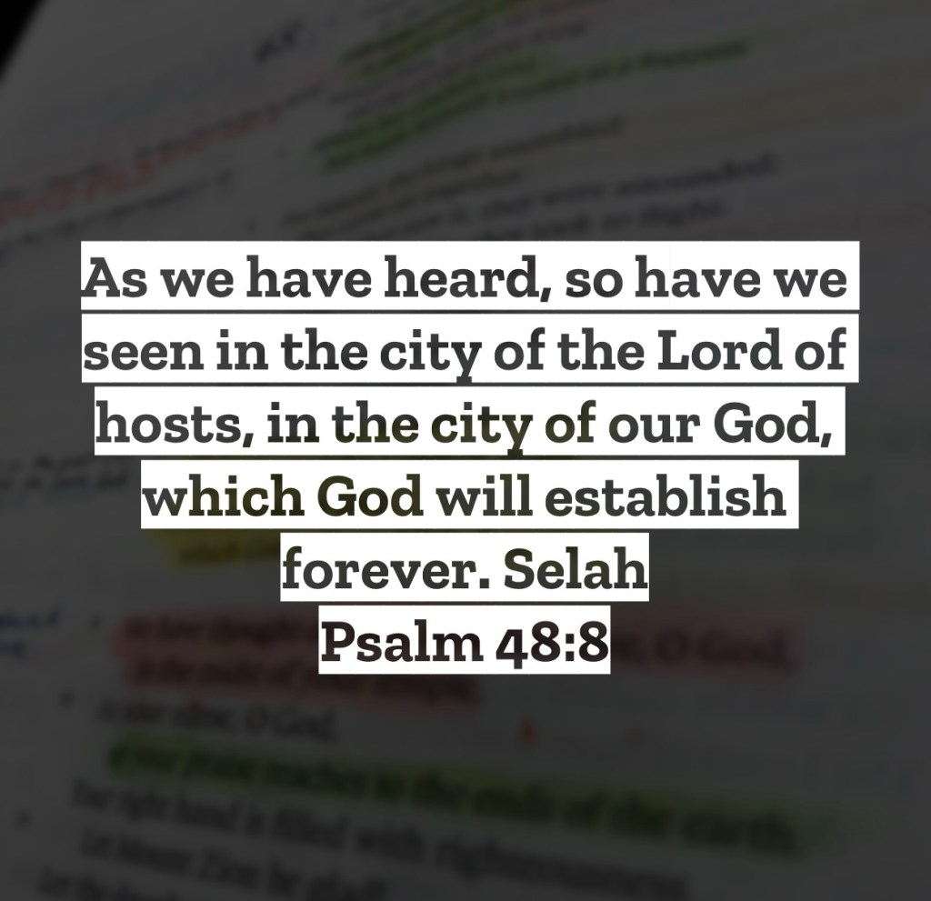 As we have heard, so have we seen in the city of the Lord of hosts, in the city of our God, which God will establish forever. Selah Psalm 48:8 – This psalm is such a beautiful psalm of reflection on God’s greatness. In past studies of this psalm, I learned about the word “perambulate.” It means to walk through a place for pleasure, dwelling on something wonderful. In verse 8 the psalm is dwelling on the wonderful things that he had heard the Lord had done in the past. Possibly things like how God had saved His people, how God formed the Heavens, or how God has promised eternity with Him for His people. What was bringing Him the most joy was the reality of what he had heard God had done wasn’t something only stuck in the past, but his own eyes had seen such wonders in his own day. He’s seen God fulfill promises and he’s seen God save His people from the hand of their enemies. The wonders of God weren’t just something in the past for him, but something within his life currently. This too needs to be a truth we are aware of as well. The wonders of God aren’t something isolated to the pages of scripture for those in the past. The wonder-working, all-power, saving God of scripture is the God that is in our story today, and He hasn’t changed. While He may move today differently than we see in scripture, know He still is moving and still is working on behalf of His people. Why though we may not be seeing it is because we haven’t taken the time to properly perambulate, for we are so busy and giving everything else in life our focus. Pause, breath, open your eyes, and dwell today on the things that God is doing and the things you have in your life only because of Jesus. When you begin to look, you begin to see the wonders of the Lord all around. I love you, but Jesus loves you more – Mac – Daily DEVO 3003