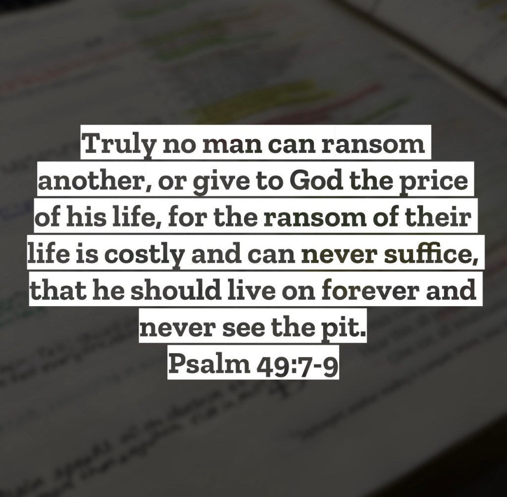 Truly no man can ransom another, or give to God the price of his life, for the ransom of their life is costly and can never suffice, that he should live on forever and never see the pit. Psalm 49:7-9 – Our psalm today is one of practical, yet eternally important, wisdom. The main message is money and wealth can’t save you in this life, and we see that message played out in the verses above. No man can pay the ransom price for someone’s life because the cost is too great, and the result of their efforts to pay their own way into Heaven is seeing the pit of Hell they sought to avoid. No wealth, no fame, no title is enough to cover the ransom cost of our sin and allow us to enter Heaven. While this humbling message it true, the glorious message is the one of the Gospel. While we could never cover the cost, Jesus could and Jesus did. We learn from Romans 6:23 that the ransom cost for our sin is death, and what we see from scripture is that Jesus Christ took upon Himself that cost by dying on the cross for us. He was and is our perfect atoning sacrifice to make a way for us to be with the Father in Heaven. While this amazing gift has been given to the world, how often do we still see people believing and living in such a way that says, “I can cover my ransom on my own without God.” They feel as if they don’t need God because they don’t want to be under His authority. They believe somehow the money and power they get in this life will carry over into the next, but sadly their beliefs are unfounded and Hell is their future. Only through Jesus can we find the hope of eternal life. If you have been trusting in anything else other than Jesus, today is the day to have a shift in what you are trusting in. I love you, but Jesus loves you more – Mac – Daily DEVO 3004