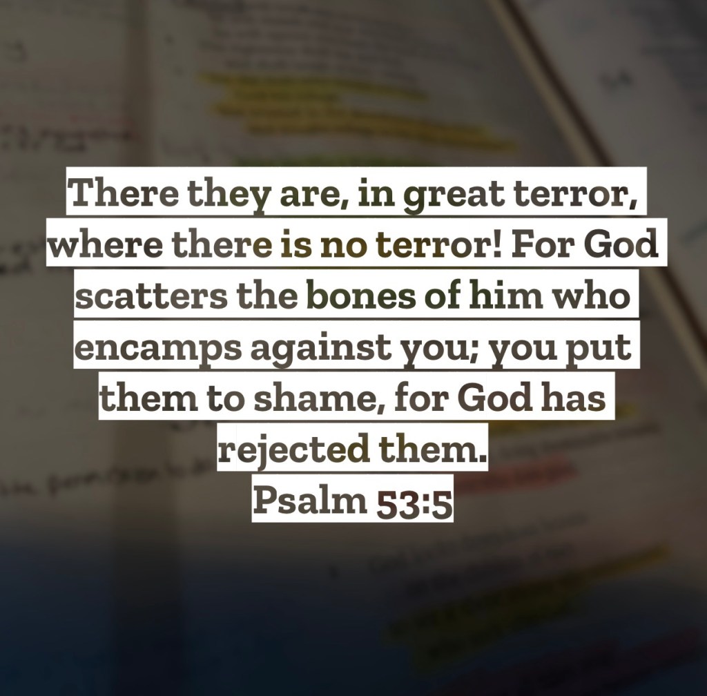 There they are, in great terror, where there is no terror! For God scatters the bones of him who encamps against you; you put them to shame, for God has rejected them. Psalm 53:5 – This psalm is almost a repeat of Psalm 14. In both psalms we see the fool, not someone who is mentally unable to understand things but someone who is making a foolish decision, rejecting the existence of God to give him “permission” to do the evil things his heart desired. One of those evil things was to come against God’s people to destroy them. The image given in this last portion of the psalm is God’s people surrounded by these fools who were seeking to do them harm. While the fools had the power and had the strategic upper hand, suddenly a great fear, for no apparent reason, came over them and they scattered. What we see taking place in this psalm is the word of God in Leviticus 26:36 being played out. “…I will send faintness into their hearts in the lands of their enemies. The sound of a driven leaf shall put them to flight…” Those that reject the Lord and His commands will find terror in places there is no reason to terror, and they’ll be scattered in the wind. Yet, for those who listen and obey the words of the Lord, what we see instead is God’s blessings and establishment. While sin can be enticing, let’s not find ourselves in the position of the fool dismissing God or minimizing God’s power so we can justify our sinful behavior. The fool says and lives in such a way that there is no God. That though will not be us who follow Jesus. We know there is a God for that God has changed our lives. That knowledge shapes how we live and how we reject the sin that’s all around us. I love you, but Jesus loves you more – Mac – Daily DEVO 3008