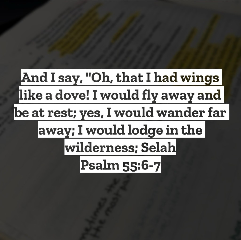 And I say, “Oh, that I had wings like a dove! I would fly away and be at rest; yes, I would wander far away; I would lodge in the wilderness; Selah. Psalm 55:6-7 - We learn from the psalm that David is once again in a season of great distress. The reasoning for such distress was because a close friend of his had turned on him and was behaving like his enemy. We aren’t given the exact situation this psalm is speaking of, and we may not even have this story of David recorded for us in scripture, but the desire of David is clear. He wanted out. He wanted to sprout wings, fly off into the wilderness, and enjoy the peaceful life he used to exist in within the sheep fields. Yet that was not God’s plan and not what God did for David, for he had to endure and remain in that heavy season. We too may find ourselves dreaming for wings to fly out of the difficult season we’re in and back into a more peaceful one. All we want is out of this hardship and finally past it, but like with David, that may not be God’s plan. You may have to remain in that hard time longer than you ever expected. While that can be frustrating and even confusing, take peace know you’re not alone in being told no to your “escape wings.” David wasn’t given the wings he prayed for. Even Jesus Himself didn’t get wings to fly away from the punishment of the cross but faithfully did the Father’s will. Having to remain in a season that we’d prefer to fly away from is a common theme we see in scripture, but see how each time God provided for His people. Often we also see the beautiful results of His people remaining in those seasons. So when you receive the no to your wings remember you’re not alone in hearing that answer, God will be with you through this, and God can make something wonderful as the result of remaining in this season. I love you, but Jesus loves you more – Mac – Daily DEVO 3010