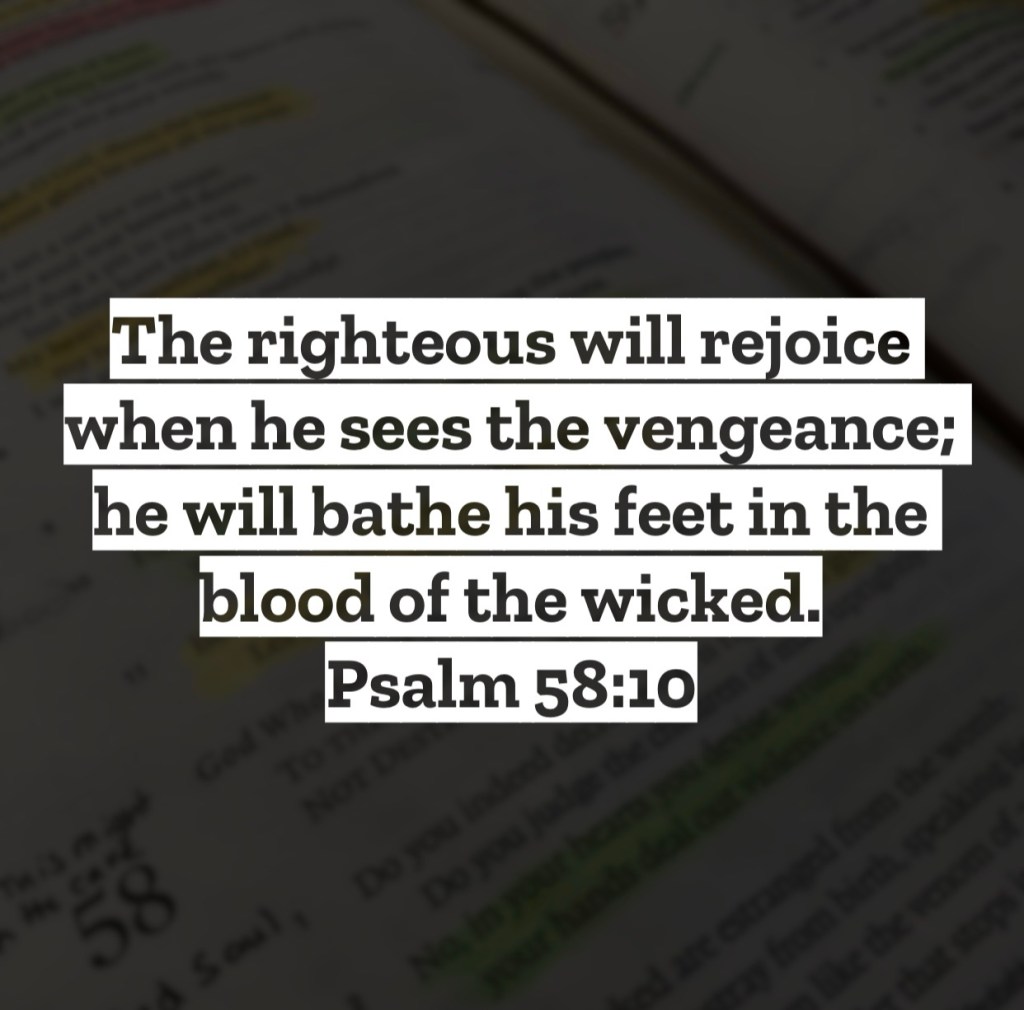 The righteous will rejoice when he sees the vengeance; he will bathe his feet in the blood of the wicked. Psalm 58:10 – This is not a verse that seems to connect with the overall message of scripture that we hear often in church that God’s loves the world and that we ought to love others. What we have in this passage is David feeling the effects of evil men’s evil choices. In his prayer to the Lord David is asking that the Lord strip away their ability to do anymore evil. Break their teeth so they can’t cause damage with their bites and tear out their fangs so they can’t envenomate anyone anymore. As Spurgeon put it, “If they have no capacity for good, at least deprive them of their ability for evil.” Yet as we read on in the passage we find our verse, the one where we’ll be rejoicing over their downfall and bathing our feet in the wicked’s blood. While a shocking message to hear, know it also doesn’t contradict the message of scripture like we thought it might. Our God is a God of justice. His desire is for all men to obey His words and live under His authority. Yet when men choose to reject Him and His way and instead choose evil, wicked ways of living, God is going to bring justice to such men. He will put an end the hurt they are causing. While God desires no one to perish and He finds no pleasure in the condemnation of any, God does find pleasure in bringing help to the helpless and standing up against injustice. We too ought to find joy is seeing evil and its power cut off. While it is heartbreaking to all when any life rejects the Lord and they face the consequences of that choice, it is wonderful to see the helpless saved and the captive freed. Pray then for the wicked that their heart would be changed before it is too late. Celebrate when the evil that once kept people enslaved and oppressed is cast out. Find joy not in the wicked being condemned but find joy that we serve a God who loves justice and stands up for those that need Him. I love you, but Jesus loves you more – Mac – Daily DEVO 3013
