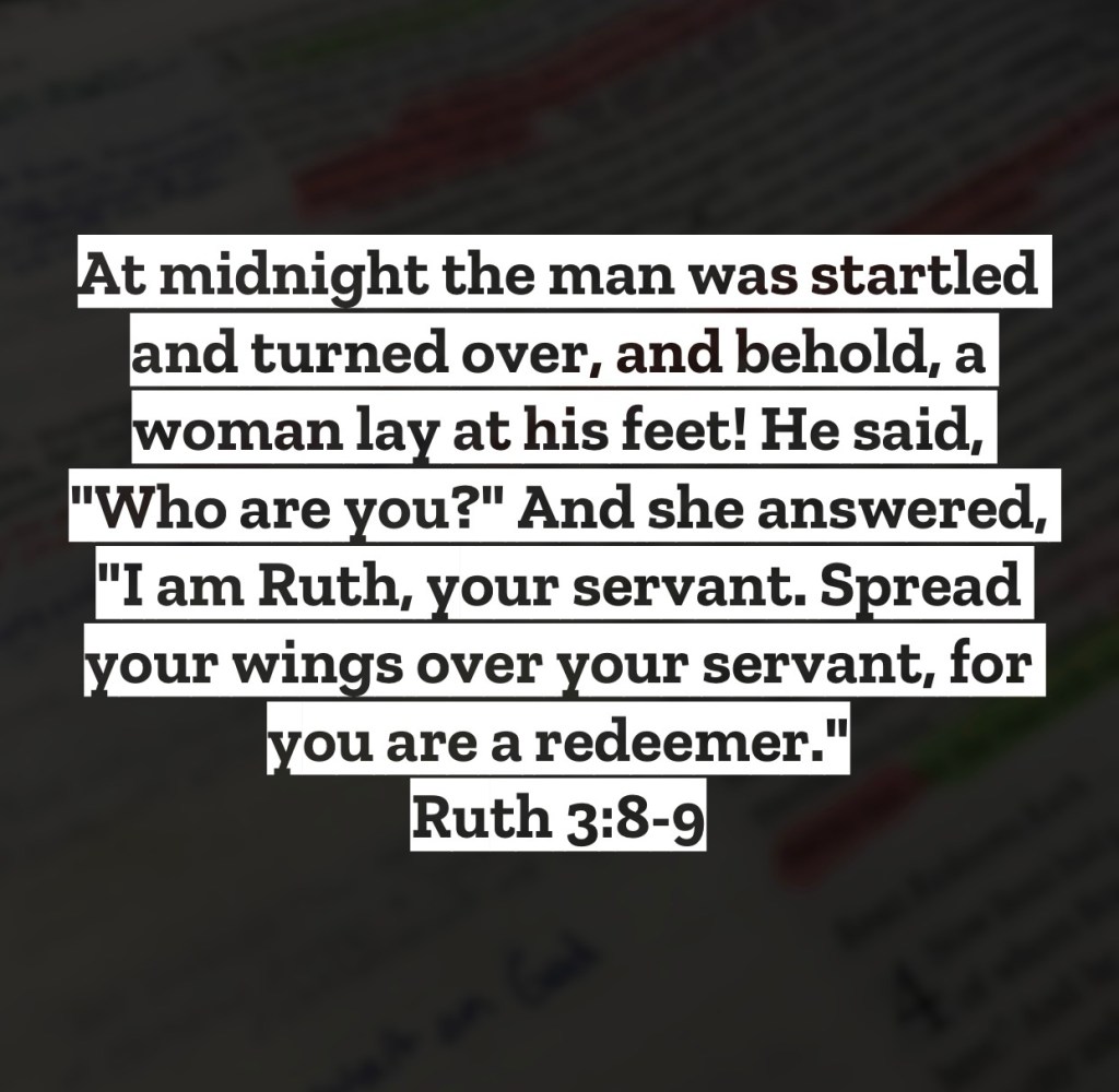 At midnight the man was startled and turned over, and behold, a woman lay at his feet! 9 He said, “Who are you?” And she answered, “I am Ruth, your servant. Spread your wings over your servant, for you are a redeemer.” Ruth 3:8-9 – In our chapter today we read about the role of a redeemer. The Hebrew word used for redeemer in our passage is “goel” and means “kinsmen redeemer.” Scripture teaches us about this unique role in a family. The “goel” would be the one in the family to protect the interests and future of the family. If some land or some family member was sold, they’d get them back. If a crime was made against the family, they’d be the ones to avenge the family. In Ruth’s case, another role of the goel was to make sure the family line continued by marrying the childless widow in the family. In our passage, Ruth is approaching Boaz with somewhat of a marriage proposal. She asks him to be her goel and to spread his wings over her. This was a custom of the Jewish people at that time where the husband would spread the corner of his clock over his wife to symbolize that she had now come under his protection. While this is a beautiful scene unfold for Ruth and Boaz, let us never forget this is our story with the Lord. In Ezekiel 16:8b the Lord is speaking and reminds us that, “…I spread the corner of my garment over you and covered your nakedness; I made my vow to you and entered into a covenant with you, declares the Lord God, and you became mine.” The Lord has spread His garment over us. Jesus has become our goel, our redeemer. We were sold off by our sin to the enemy, but the Lord paid our ransom so we could be brought back into His family. We have a redeemer and His name is Jesus. Praise the Lord we have been brough under the wings of Jesus’ protection and welcomed into His family. I love you, but Jesus loves you more – Mac – Daily DEVO 3018