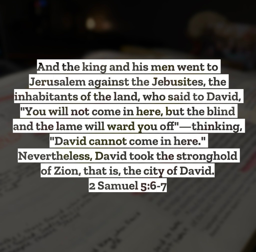 And the king and his men went to Jerusalem against the Jebusites, the inhabitants of the land, who said to David, “You will not come in here, but the blind and the lame will ward you off”—thinking, “David cannot come in here.” 7 Nevertheless, David took the stronghold of Zion, that is, the city of David. 2 Samuel 5:6-7 – David is crowned king finally over all of Israel, some 15 years after Samuel anointed him king. One of David’s first tasks was to take over the city of Jerusalem from the Canaanites to build a royal city for himself. While God gave His people around 400 years prior the command to rid the promise land of the Canaanites, Jerusalem still hadn’t been taken over yet, and the inhabitants weren’t going to go easily. They mocked David and made it clear he could never breach the city, even their weakest in the city could fight him off. Nevertheless, even though the city was strong, even though the city was well defended, even though it had been in the hands of the enemy for far too many years, David was able to take the city. Such is our story with Jesus. Our lives were in the hands of the enemy for far too long. The enemy was strong and mocked any who would come and try to take us from his hands. But God, who loves us so much, sent our Savior Jesus Christ to break the stronghold of the enemy and rescue us from his vile hands. No one has been in the enemy’s hands too long and no barrier the enemy puts up it too difficult for Jesus to break. If you have found that rescue today, live today in such a way that praises your Rescuer. If you have not found that rescue yet, know Jesus has already broken the grip of the enemy and all there is now is for you to come to Jesus. If you have questions about how to do that, reach out. I love you, but Jesus loves you more – Mac – Daily DEVO 3024
