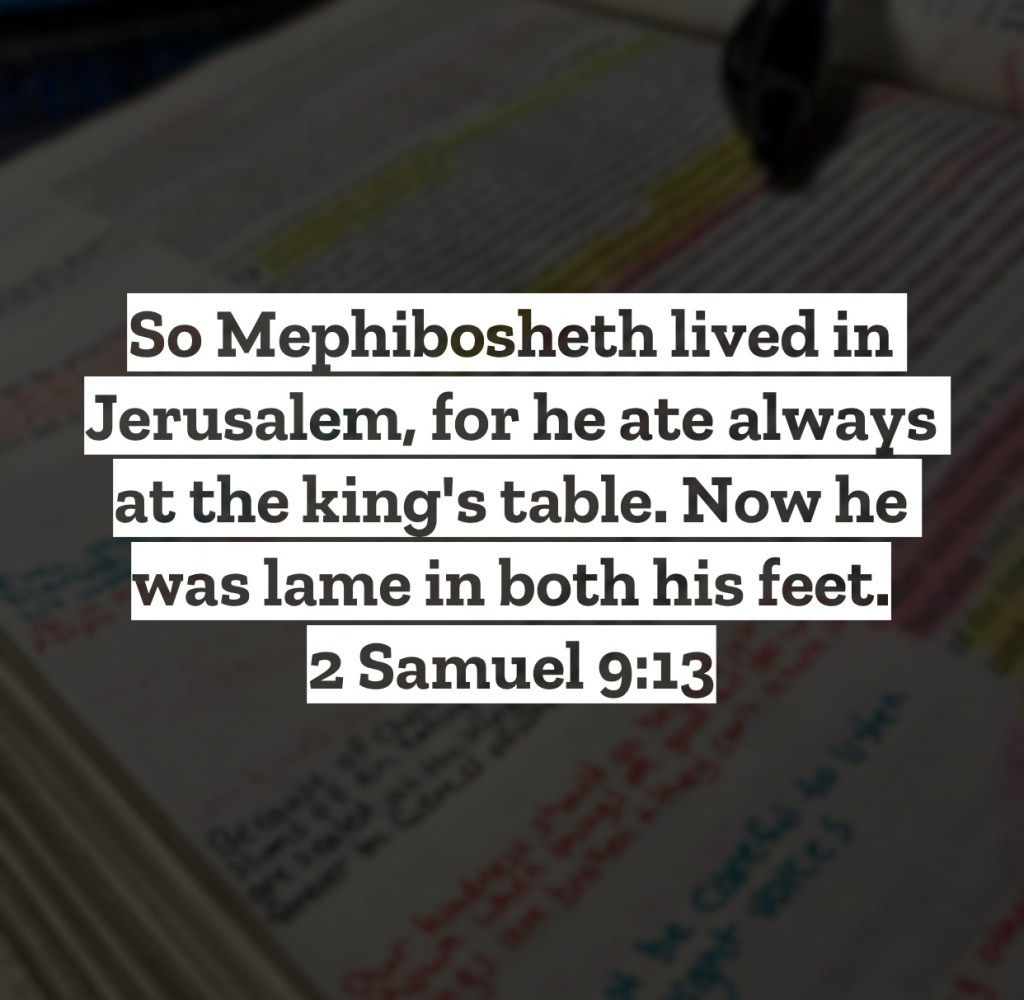 So Mephibosheth lived in Jerusalem, for he ate always at the king’s table. Now he was lame in both his feet. 2 Samuel 9:13 – While the story we see unfold in this chapter doesn’t seem too outrageous to us, especially considering the heart of David, it would have seemed that way to those in David’s day. The custom in this time whenever a new ruler came to power was to massacre any who were connected to the previous ruler. For David to not do this, and to instead seek out Saul’s family to show God’s kindness to them, this was a unique move by David. When reading this passage we can certainly glean some lessons on how we ought to treat others. To show love to those who culture says not to, to seek out opportunities to show kindness, and to keep our promises even when no one would know if we didn’t. Yet in the grander picture of life, we aren’t the “David” in this story showing the kindness, we are “Mephiosheth.” Remember because of sin we were cast out of the kingdom, hiding from the King as Adam and Eve did, worried death was going to come our way if we ever were found by the King. Yet instead of death, our King Jesus sought us out, found us, saved us, and has sat us at His table to enjoy His food forever with Him. This honor shouldn’t be ours, but it is because of the King’s love for us. Remember then because of Christ you are no longer in the slums of sin eating the scraps of satan. You are seated at the King’s table forever enjoying the fullness of what He has to offer, all because of Jesus. Now that we have been granted such kindness, let’s seek to demonstrate that level of kindness to others. I love you, but Jesus loves you more – Mac – Daily DEVO 3028