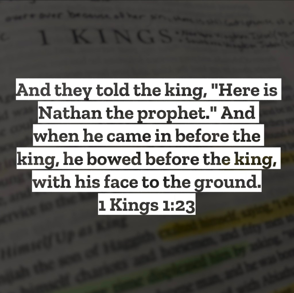 And they told the king, “Here is Nathan the prophet.” And when he came in before the king, he bowed before the king, with his face to the ground. 1 Kings 1:23 - We have a biblical game of thrones happening in this chapter. One of David’s son is seeking to take advantage of his father’s old age and slip into the seat of Israel’s throne as its new king. We see though in this chapter David discovers this and handles it, anointing Solomon instead as his successor. What’s unique though about this situation is how David came to the knowledge of this initial scandal. As we see in our verse above, Nathan the prophet was invited into the kings chambers and welcomed by the king to speak to him. Keep in mind the last time Nathan is recorded in scripture is when he boldly condemned the actions of King David surrounding Bathsheba. One might think David would be bitter, even possibly hating Nathan for speaking against him like this. That though isn’t the image we see, instead David welcomes Nathan’s input. So should our posture be with the people who love us enough to speak the words that are difficult for us to hear but we need to hear. We could grow bitterness and hatred towards them because they are saying such hard things to us, or we could celebrate that we have someone bold enough to say the hard things we need to hear. Welcome then the “Nathans” in your life. If someone is willing to speak hard things to you out of love for you, they are demonstrating they actually care about you and your life with the Lord. Welcome that person, that “Nathan,” and be willing to listen to what they have to say. Count it as a blessing from the Lord if you have a “Nathan” like this in your story. I love you, but Jesus loves you more – Mac – Daily DEVO 3044