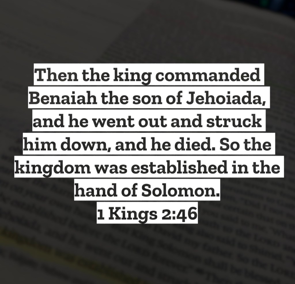 Then the king commanded Benaiah the son of Jehoiada, and he went out and struck him down, and he died. So the kingdom was established in the hand of Solomon. 1 Kings 2:46 – The 40 year-long reign of David has ended and now Solomon his son takes the throne. Yet before his death, David gave Solomon some directions on how to firmly establish his kingdom. Solomon needed to take care of the individuals in the kingdom that were troublesome to the throne for David so they wouldn’t cause trouble for him when he took the throne. As we can see from our verse above, the way Solomon “handled” such troublers was quickly and ruthlessly. While we may have our opinions on how Solomon chose to handle these people, the end result was his kingdom being established and all the individuals that brought trouble were no longer around to bring trouble anymore. Something that we must be willing to do as we find ourselves establishing into new seasons of life is “handling” the troublers from the previous season of life. Now this is not me telling you to go kill people, please don’t do that! This is me pushing you to address the sins in your life that brought trouble to you in the last season and make sure they aren’t allowed to follow you into the new season. Don’t believe that simply because there is a change in your life that all the past struggles with sin you had won’t follow you into the future. If you struggled with lust before marriage, you’ll struggle with if after marriage. If you struggled with greed in the low-paying job, you’ll still struggle with it in the high-paying job. Choose to handle these troubling sins by coming to the Lord for help so these sins won’t follow you into the next season causing havoc. God’s heart to is establish you into the calling He has for you, lean on His help to handle your sin. I love you, but Jesus loves you more – Mac – Daily DEVO 3045
