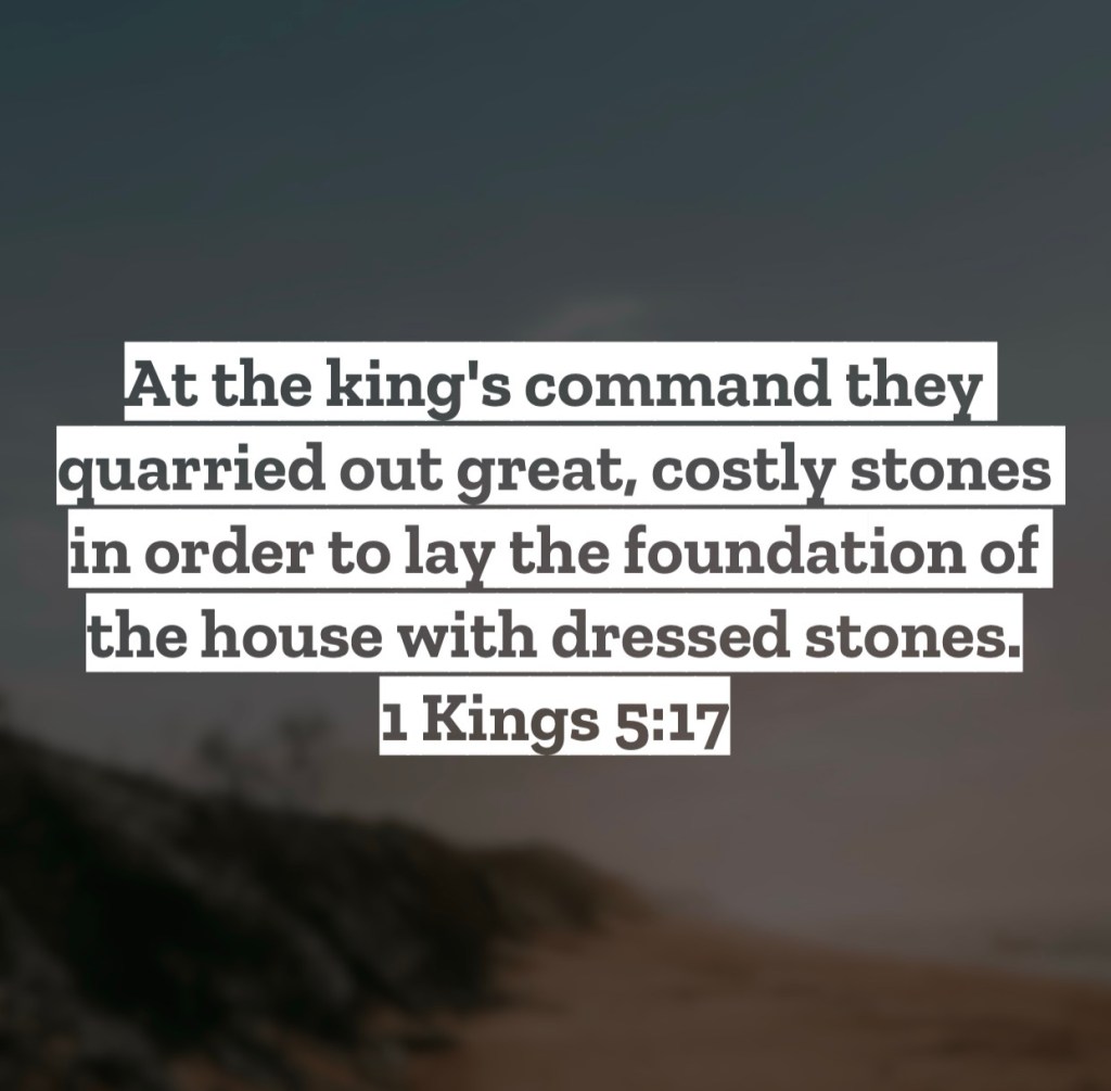At the king’s command they quarried out great, costly stones in order to lay the foundation of the house with dressed stones. 1 Kings 5:17 - The massive undertaking of building the first temple of the Lord was now under way. King Solomon sent word to the neighboring land of Lebanon to purchase wood from them. The king also set apart tens of thousands of workers to dig for and cut costly stones to be used in the building. Something to take note of is the quality that Solomon sought to build with. Lebanon’s cedars were the best of the best wood you could build with. For the foundations of the temple only great, costly stones would be used. As we’ll see further along in the process of building the temple, Solomon only used the most excellent resources his great wealth allowed him to get. This example is one the Lord desires us to follow when we think about building up His church. Only the best should be given. God deserves more than our scraps of time and our halfhearted efforts. He deserves everything we can give Him! If then you were to evaluate the quality of your work for the Lord, whether it’s work given to building up the church or growing your own walk with the Lord, is the quality the best it could be? Or is the Lord more often getting our leftovers instead of our first fruits? As we live for Jesus today, seek giving the Lord even just a little better quality of whatever it is you’re giving to Him. He deserves the best, and a start to getting there is giving Him more of you than you did yesterday. I love you, but Jesus loves you more – Mac – Daily DEVO 3048