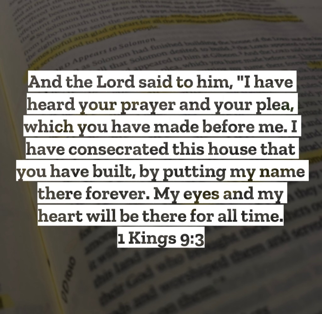 And the Lord said to him, “I have heard your prayer and your plea, which you have made before me. I have consecrated this house that you have built, by putting my name there forever. My eyes and my heart will be there for all time. 1 Kings 9:3 – In chapter 3 we see the Lord speak to Solomon (this was the time when He give Solmon his wisdom), and now Solomon is blessed with a second appearance from the Lord. After building the temple and after sacrificing on the altar an abundance of offerings, Solomon prayed that the Lord would see their work and bless the people that worshipped Him there. God graciously appears to Solomon, tells Solmon He had heard the prayer, and we see in our verse God consecrates the Temple. This means God made it holy, He set it apart for Himself. This is a very important lesson we need to remind ourselves of. We aren’t the ones that make anything holy. We can’t make a worship service holy. We can’t make church holy. We can’t make a person holy. Only God can do that. Only God can take away sin, which reveals our desperate need for His work in our lives. Pray then that God would make your church and times of worship holy for Him, that they would be separated from sinfulness completely and only filled with His Holy Spirit. Pray that God will make holy the lost around you, that He will call them to Himself and He will save them. If you have been saved from your sin, dwell on the reality that it was not you who saved you and made yourself holy. It wasn’t your efforts that earned you the descriptor of “holy,” you carry that only because of the sacrifice of Jesus and the grace of God. While its humbling to think that we can’t even make ourselves holy enough to be close to God on our own, praise the Lord we have a God that enjoys doing that for us. I love you, but Jesus loves you more – Mac – Daily DEVO 3053