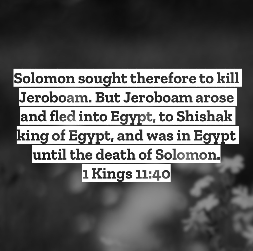 Solomon sought therefore to kill Jeroboam. But Jeroboam arose and fled into Egypt, to Shishak king of Egypt, and was in Egypt until the death of Solomon. 1 Kings 11:40 – With great power comes great responsibility. Solomon had firmly established his kingdom and his power was vast. We see in this chapter though the decline of this wise, powerful king. Solomon’s issues were with his unfettered lust, for he took 1000 wives and concubines to feed his desires. These wives were of foreign nations, something God said not to do, and they led Solomon spiritually away from the Lord and after all their idols. As a result, God kept His end of the deal, that if Solomon wouldn’t follow Him then someone else would take the role of king of Israel, therefore we see our new character Jeroboam. Yet as Solomon heard of this, he sought to kill Jeroboam, hoping to thwart the plans of God. Sounds a lot like the story of Saul and David huh? Saul broke the covenant he had with the Lord and the kingdom was given to another, yet Saul sought to kill the one who the kingdom was handed to. We learn here a couple things. First, man is not that different from one age to the next and sin still tempts us away from the Lord just like it did thousands of years ago. Second, God is consistently good on His word. For us then let’s realize that the same sins that plagued Saul and Solomon are present in our world today and still have the goal of leading God followers away from Him. Also realize that all the promises of God are true, even the ones where God says He’ll help us through and beyond the temptations of this world. No temptation today is something new that God hasn’t already successfully helped a follower of His through. God’s heart is that you remain faithful to Him, choose today to see from our passage the loss sin can bring and the realness of God’s promises. I love you, but Jesus loves you more – Mac – Daily DEVO 3055