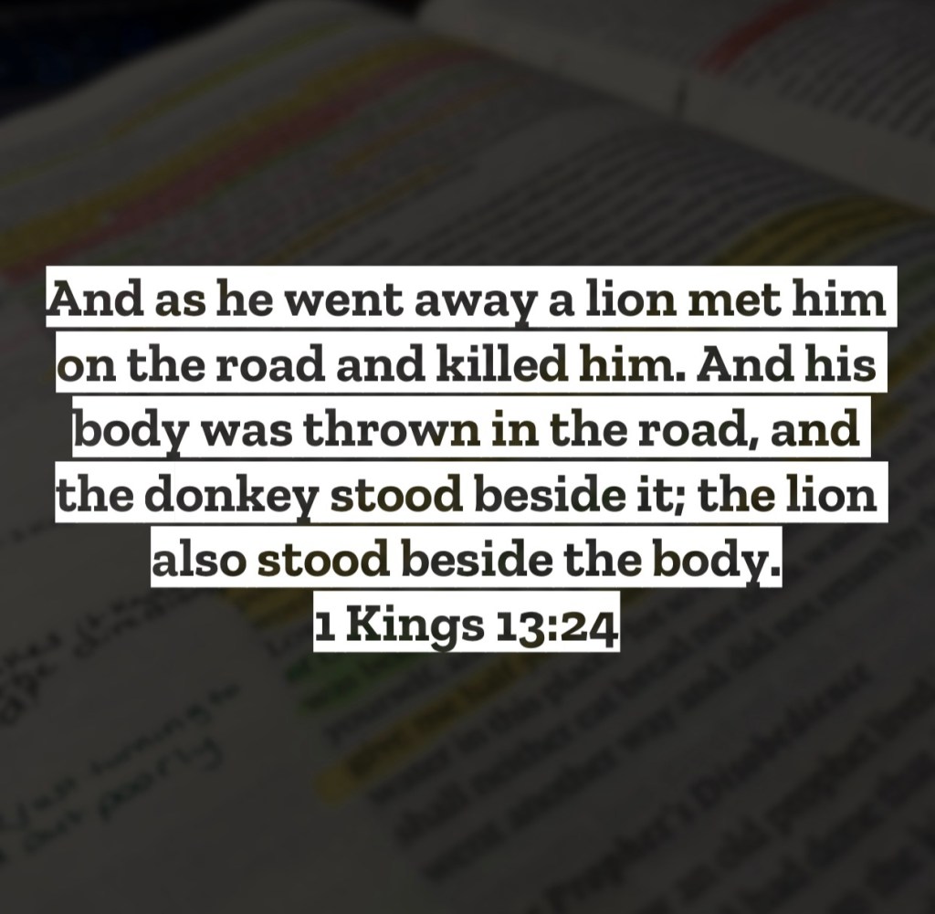 And as he went away a lion met him on the road and killed him. And his body was thrown in the road, and the donkey stood beside it; the lion also stood beside the body. 1 Kings 13:24 – In my days of working at a zoo, I spent a lot of time working with the big cats there, and this sort of behavior would have been extremely uncommon. First for a lion to attack prey just for the fun of it, for we see later on the lion didn’t eat the prophet, isn’t the norm for a wild animal. Then for the lion to stand beside the body with the donkey and not attack the donkey, nor the other people who passed by, would have been highly unusual. Clearly everyone at the time of this event, and us who are reading it many years later, can tell this was a situation brought about by the Lord. All the extremely unusual aspects of this story reveal that God’s hands must have been orchestrating it. As we then progress through the events of life, allow the extremely unusual happenings in life to be reminders to refocus on the Lord. When we come out unhurt from an accident that should have killed us, when the disease just decides to completely leave one our day, or when see that hardened, lost person falls on their knees at the altar…these are unusual things that happened because God’s hands were all over them. Let then the sight of such unusual happenings cause your eyes to begin looking faithfully towards your Heavenly Father once again. I love you, but Jesus loves you more – Mac – Daily DEVO 3057