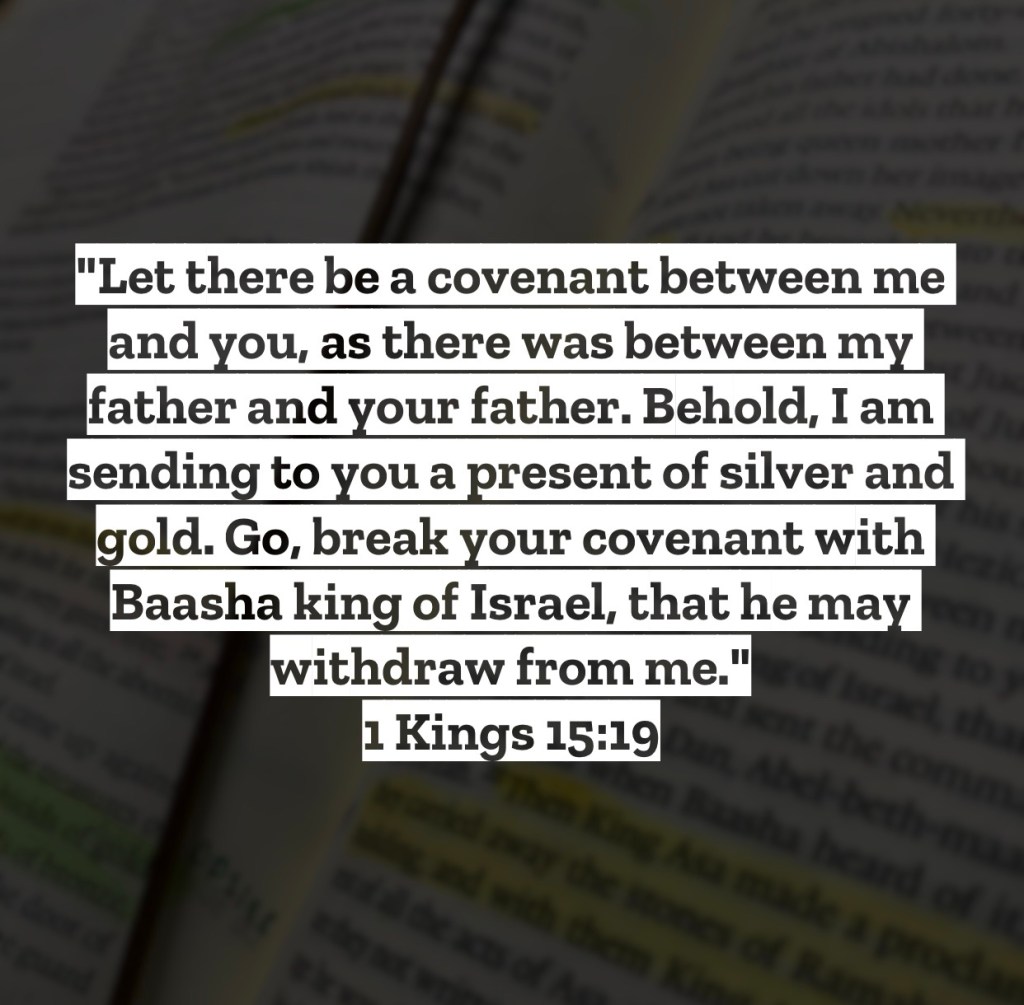 Let there be a covenant between me and you, as there was between my father and your father. Behold, I am sending to you a present of silver and gold. Go, break your covenant with Baasha king of Israel, that he may withdraw from me. 1 Kings 15:19 – Yesterday we looked at a story with King Jeroboam who was an evil king, yet when there was a dire issue with his son’s health, he turned to the Lord for help. Now we are seeing the opposite unfold, Asa was a good king, meaning he followed after God the way God commanded. During his time as king though the king of Israel and his armies began to wage war on Asa. As the enemy army came to his doorstep, here is where we see Asa pivot from his holy pursuit of the Lord. Instead of relying on the Lord for help, he turns to a neighboring land for war assistance. As the Lord was displeased with Jeroboam’s only coming to Him when life was bad, so was the Lord displeased with Asa not coming to Him when life was bad. We certainly see though God work in the lives of these two differently because of their life of faith (or lack thereof). The message then today is going to echo that of yesterday’s, God isn’t looking to be our God only in certain seasons of our life. He isn’t wanting to only be our safety net to rely on when everything else in life has failed us. He also though isn’t wanting to only be our God in the good times, yet when life gets hard, we turn to worldly things for our rescue. God desires to be our God in all times. He wants us turning to Him when in the ups, downs, and everything in between. However then today is for you, whether blessing or hardship, know the Lord longs for you to come to Him. I love you, but Jesus loves you more – Mac – Daily DEVO 3059