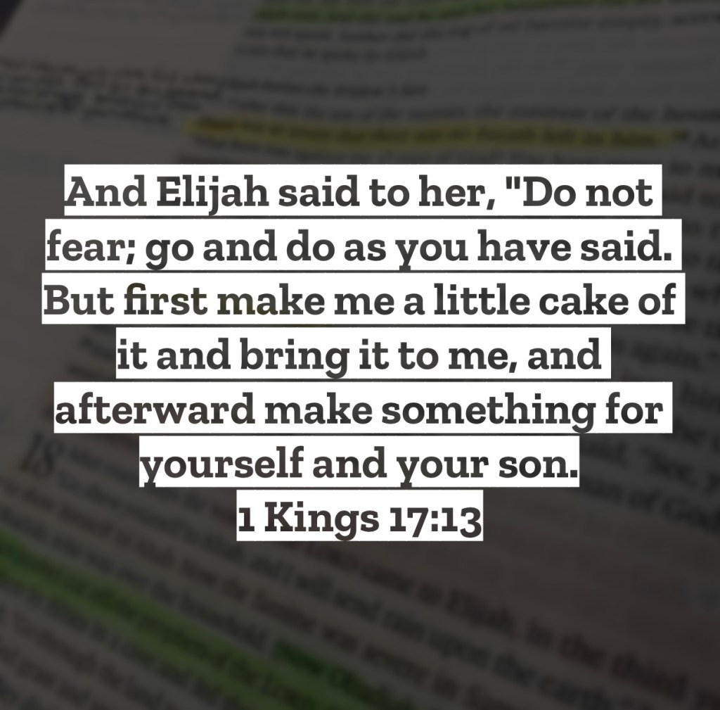And Elijah said to her, “Do not fear; go and do as you have said. But first make me a little cake of it and bring it to me, and afterward make something for yourself and your son. 1 Kings 17:13 – At first, this verse seems very basic, Elijah asking a lady to make him some cake then to make some for her family afterwards. Let’s remember the context here though. Israel is being punished for their sinfulness by a multi-year drought. There is no water, and food is scarce at this time. Elijah then walks into a city that is not a God-following place and finds a gentile widow that is so poor that her plans were to use the last bit of ingredients she had to make a small cake for herself and her son to eat and then die. That poor widow is the one Elijah tells to make a cake for him…and she did. Yes, she did have the words of Elijah telling her that God would provide for her and her son flour and oil until the drought was over, but for this gentile woman living in a land of idolatry, these words likely sounded too good to be true and this prophet just wanted her last bit of food for himself. She though faithfully followed the command of Elijah, and the words of God were true and her ingredients didn’t run out. What faith we see come from this poor, gentile widow who was about to die! Would such faith be found in us? If God were to ask you to give up something, would you? Would you believe His promises that He’d provide for you beyond the sacrifice? Has God ever failed to keep His word or failed to provide for your need? Why then are we so afraid to give God our last “cake?” We will never experience the miracle beyond the sacrifice if the sacrifice never takes place. I love you, but Jesus loves you more – Mac – Daily DEVO 3061