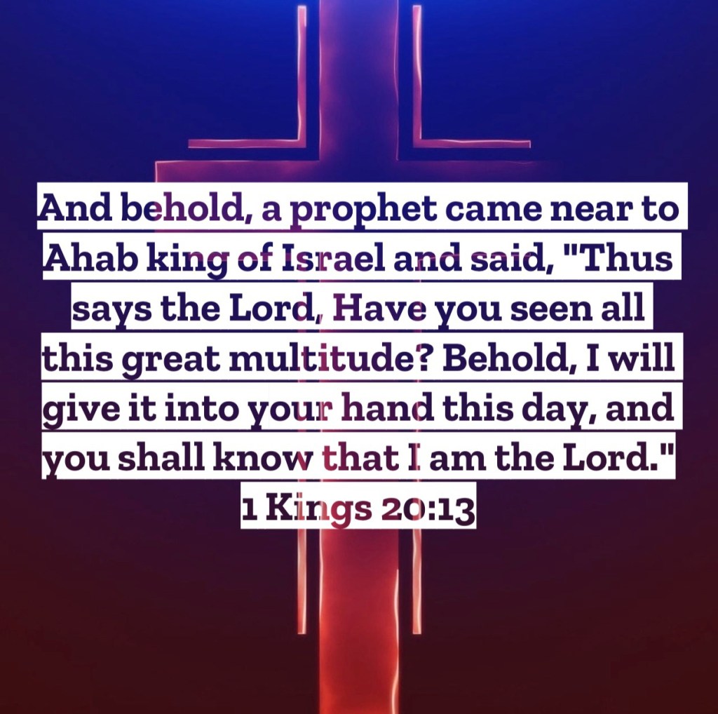 And behold, a prophet came near to Ahab king of Israel and said, “Thus says the Lord, Have you seen all this great multitude? Behold, I will give it into your hand this day, and you shall know that I am the Lord.” 1 Kings 20:13 – Ahab certainly goes down in the history of Israel as one of the nation’s most wicked kings. He married an evil queen, led the nation in disgusting idolatrous practices, and forsoke the worship of the Lord. Yet, despite having no faithful pursuit of the Lord, we see the Lord seeking the heart of Ahab. On Mount Carmel God displayed His realness over the idols Ahab worshipped by sending fire down from Heaven. Now in our chapter we have the massive Syrian army coming against the much smaller nation of Israel, a battle that on paper would be a slaughter for Israel if they fought. God though steps in and says He’ll take care of this enemy for Ahab, and does this twice in our chapter. Why? So Ahab would know that the Lord is the one true God. As I write this devotion it’s Good Friday, and about the exact time of day of me writing is when Jesus was crucified. It’s a humbling day for those who believe in Jesus for we remember the ultimate sacrifice Jesus paid for us. As with Ahab and these victories, so was God’s plan for Jesus’ death and resurrection. God wanted us to see through His defeat of death that He was the Lord, the one and only true God. As Ahab was able to stand after the battle, seeing the impossible-for-him-to-defeat enemy defeated before him, so are we standing here today seeing death defeated before us because of Jesus. Now the question is what will be our response? I pray it’s to acknowledge Jesus as Lord and to serve Him today as such. I love you, but Jesus loves you more – Mac – Daily DEVO 3064