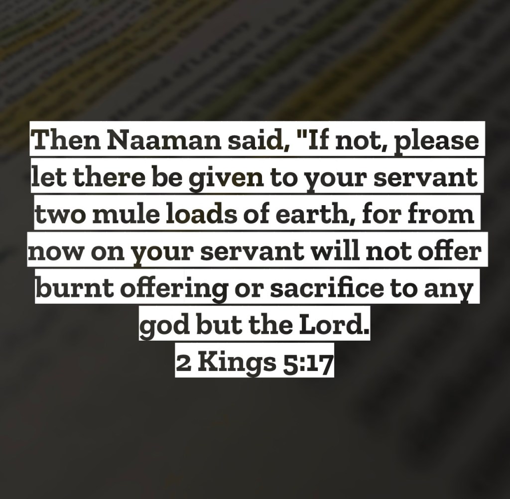 Then Naaman said, “If not, please let there be given to your servant two mule loads of earth, for from now on your servant will not offer burnt offering or sacrifice to any god but the Lord. 2 Kings 5:17 – A truly wonderful, life-changing miracle took place in the life of Naaman. While a mighty warrior, he was inflicted with the terrible disease of leprosy. Yet after a visit to Elisha and following the commands Elisha gave him, Naaman was cured. Overjoyed at his healing and now a follower of the one true God, Naaman asked a request that seems a little odd to us. He asked Elisha for two mule loads of dirt to take home with him. Why? Likely because in their day much of their beliefs around gods were they were isolated to certain geographical locations. Meaning there was the god of Moab or the god of Caanan, and these gods were only found in these lands. So when Naaman found healing from the God of Israel, he wanted to take back some “Israel” with him so the God of Israel would come back with him as well. We can’t blame him for this simple way of thinking for he had never been taught spiritually different, this was the thinkings of a new believer. Let us though today be overjoyed that the Lord isn’t some god that is only over a certain small area of land, but is over all the universe and everything within it. We don’t have to carry dirt around so our God is near us, He is everywhere at all times. So when you are in your office chair, or kitchen at home, or in the car driving to the hospital, God is always there with you. Praise the Lord we serve a God who is with us always and never leaves our side. I love you, but Jesus loves you more – Mac – Daily DEVO 3071