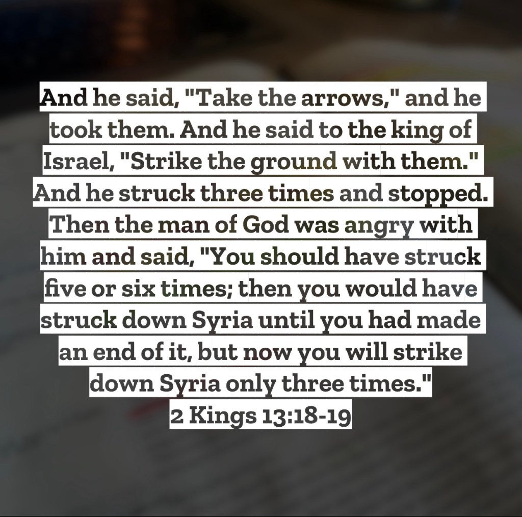 And he said, “Take the arrows,” and he took them. And he said to the king of Israel, “Strike the ground with them.” And he struck three times and stopped. 19 Then the man of God was angry with him and said, “You should have struck five or six times; then you would have struck down Syria until you had made an end of it, but now you will strike down Syria only three times.” 2 Kings 13:18-19 – Why was Elisha having the king do all this with the bow and arrow, and why was Elisha so angry with the king for not striking more times when it seems no direction was given? Elisha was giving the king what Israel’s state would be after Elisha’s death. That while Elisha was to die, the Lord who was actually protecting them was alive forever. While the king had some context on what was going on, his actions in that moment would dictate the future battle victories over his enemy. Life and death were hanging in the balance of how many times the king struck these arrows. While it may seem odd that the Lord would allow such things like life and death be held in the choices of man, isn’t this the case with our choice to share the Gospel? Our choice today to be faithful to the Lord by sharing His good news with the lost is holding the lost’s eternal life in our hands. When we refuse to share, when we refuse to care about the lost and their eternal life, we are making a choice that could keep them from ever hearing the Gospel. Hopefully we are not the only individual or the only way that God is going to introduce Himself to them through, but we may be. You today may be the only person that will ever introduce Jesus to that individual…will you? While we don’t know how many Christians will pass by them or how long they still have to live, we do know they need Jesus today. Let’s share that with them. I love you, but Jesus loves you more – Mac – Daily DEVO 3079