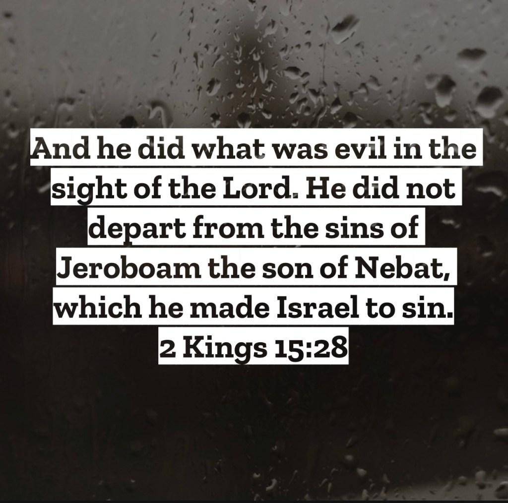And he did what was evil in the sight of the Lord. He did not depart from the sins of Jeroboam the son of Nebat, which he made Israel to sin. 2 Kings 15:28 – Within this short chapter we see the reign of five different kings of Israel, and each reign was plagued with treachery. One reigned for six months doing evil in God’s eyes, one killed the previous king and reigned for a month before being assassinated himself, one reigned for ten years and established his reign by terrorizing cities and slaughtering those in it. While so many different kings, different lengths of reigns, and even different avenues they became king, we see something stayed consistent throughout the years…sin. Likely if you’ve been reading along with me you seen that phrase “He did not depart from the sins of Jeroboam” many times. Jeroboam was the king that made idolatry an acceptable practice within the kingdom, even something the government sponsored to make happen. That choice lead to generations of kings who fell into the trap of idolatry themselves and led the northern kingdom of Israel into generations of sin. While not a new message for these devotions, the consequences are repeated enough in scripture that we ought to repeat the teaching. Your choices with sin will impact more than just you. Maybe generations of kings won’t follow in your footsteps, but your family and your church and your community around you will feel the weight of your choice to sin. And while it’s likely not your intent, be aware that some may follow your lead into sin. Be aware of how your sin can lead not only you away from intimacy with God, but how it can even lead someone from never placing their faith in God to begin with. Choose to love those around you by hating sin. I love you, but Jesus loves you more – Mac – Daily DEVO 3081