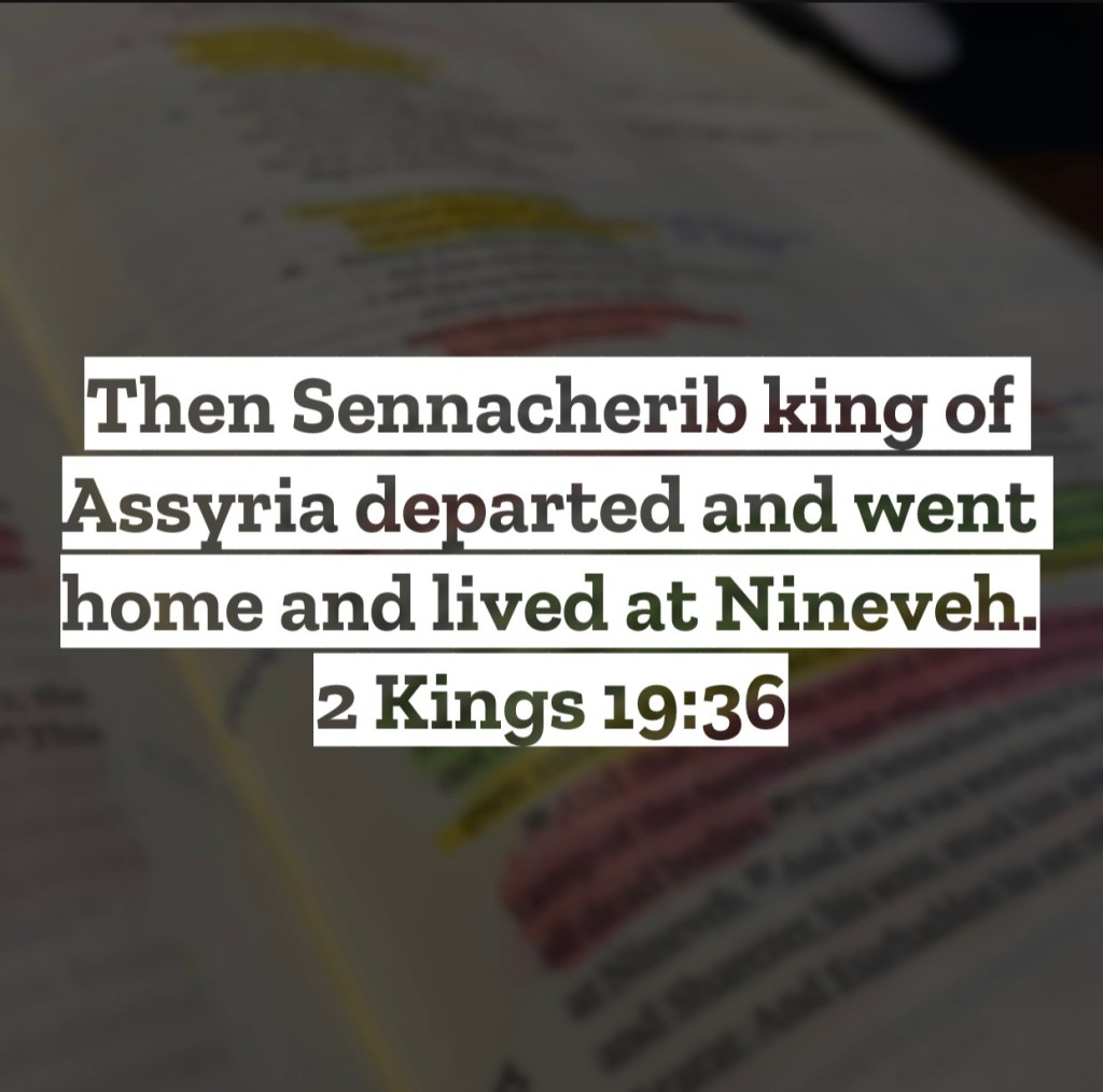 Then Sennacherib king of Assyria departed and went home and lived at Nineveh. 2 Kings 19:36 - This is sort of a basic, boring verse to be our key verse for the devotion, isn’t it? Yet when shared to King Hezekiah and the people of Judah, this would have been the embolden letters on the front page of their newspaper. Assyria was on a war path, conquering city after city, destroying many to dust. Now the target of Assyria was locked onto Jerusalem. Deadly threats were spoken against Jerusalem and it appeared that the city was going to be wiped out. Yet, through the faithful prayers and actions of King Hezekiah and the Lord’s promise to protect David’s throne, this plan of Assyria didn’t unfold. God sent an angel and took out 185,000 of the enemy’s soldiers. After this massive loss we see our key verse written. No battle against Jerusalem and not even a single arrow was shot at the city. God completely protected the city, exactly like He said He would. Instead of watching his city burn, Hezekiah was able to watch his enemy return home utterly defeated. All because of the Lord. I don’t know what imposing enemies may be at your gates threatening you with total defeat. Possibly fear, or anxiety, or maybe an actual person or group of people. In such a season, bring this situation and lay it at His feet. Trust His promises to take care of His people and watch how the Lord provides for those who cast their cares upon Him. I love you, but Jesus loves you more – Mac – Daily DEVO 3085