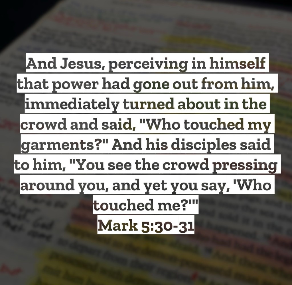 And Jesus, perceiving in himself that power had gone out from him, immediately turned about in the crowd and said, “Who touched my garments?” 31 And his disciples said to him, “You see the crowd pressing around you, and yet you say, ‘Who touched me?’” Mark 5:30-31 – Something that is standing out to me in this reading of the gospel over previous times is that level of the crowds Jesus was having to work in. Often we’ll see pictures of Jesus sitting peacefully on a rock teaching a handful of people, but that’s not the image we’re getting here in Mark. He is overwhelming surrounded by people, pushing and shoving, trying to get close to Jesus, likely bumping into Him constantly. Which makes the disciples’ statement understandable. Who touched you in this crowd Jesus? Literally everyone here is touching you and bumping into you. Yet Jesus was able to discern the difference between the crowds pressing in on Him and the touch of faith expressed by this woman. Let us also be aware of this truth, we can be near Jesus, pressing into where He is at, and knocking into Him, but not actually reaching out to Him in faith. You can be in church but not actually feel Jesus. You can read your Bible but not actually hear from Jesus. You can be where Jesus is at and totally miss Him if your heart isn’t reaching out to Him in faith like this lady in our passage was. Choose then to approach your time with Jesus differently if recently you haven’t been feeling His presence or blessing in your times of drawing near to Him. Know He is always close and always available, what’s needs to be examined though is where is our heart at as we approach Him. I love you, but Jesus loves you more – Mac – Daily DEVO 3096