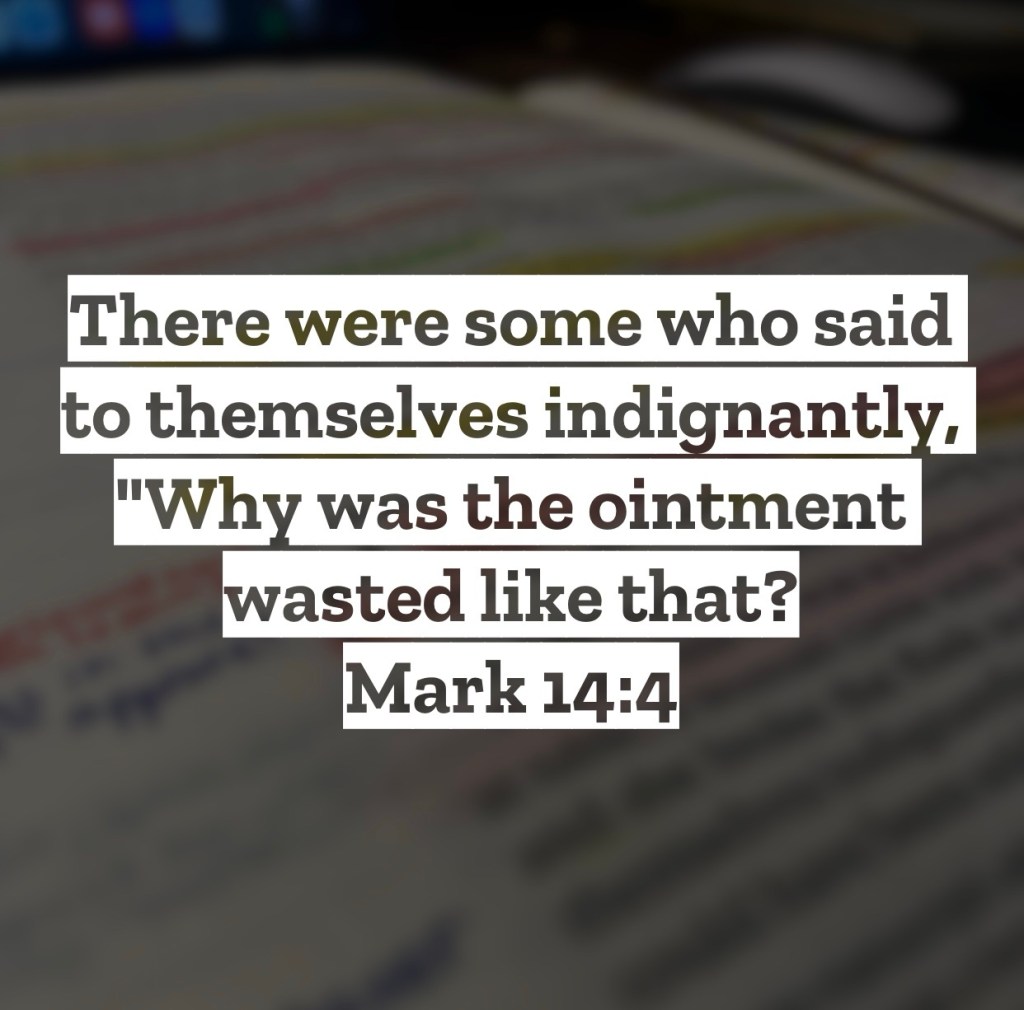 There were some who said to themselves indignantly, “Why was the ointment wasted like that?” Mark 14:4 – From the other Gospels we get a few more details surrounding this account. We know the lady anointing Jesus was Mary, the sister of Martha and Lazarus. We also know that the key person to complain about what she did was Judas, but from our verse we know he wasn’t the only one there having an issue with what she did. As we see from our verse, Judas and the others said this was a waste. The word in Greek used for waste here is “apóleia.” What’s interesting is other words it can be translated to: destruction, ruin, and even perdition. In fact, in John 17:12, when speaking of the son of perdition, meaning Judas who would betray Jesus, this same word “apóleia” is used. Wiersbe said this of this passage, “Judas criticized Mary for ‘wasting money,’ but he wasted his entire life!” Sometimes we too can be judgmental and critical of the ways people are handling their life for the Lord. Maybe it’s in the ways they are serving or using the blessings God has given them. We can say they are wasting their time there or wasting their talents by not using them how we think they should. Yet instead of judging other’s ways of serving the Lord, can we say we aren’t wasting anything in our serving of Him? Do we waste opportunities to share the Gospel or waste time that could be used for God by giving it to something pointless? Likely we have enough to focus on with making sure we aren’t wasting our life with the Lord that we won’t have time to worry about how other people are “wasting” their life. Yes, be a solid brother or sister in Christ encouraging each other to continue in their devotion to the Lord, but leave out the judgmental attitudes about how you think they should serve the Lord. The best place for you to make sure things aren’t getting wasted for the Lord is focusing on your own walk with Him. I love you, but Jesus loves you more – Mac – Daily DEVO 3105