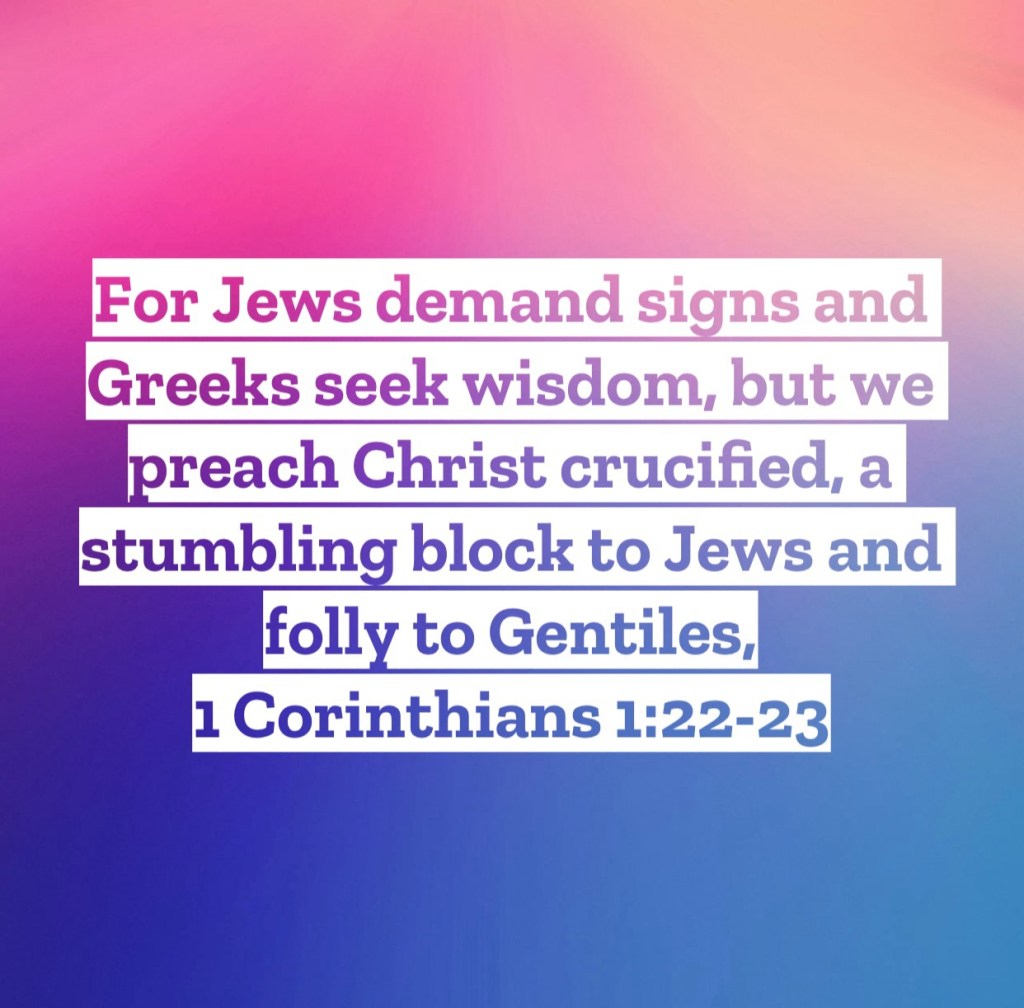 For Jews demand signs and Greeks seek wisdom, but we preach Christ crucified, a stumbling block to Jews and folly to Gentiles…1 Corinthians 1:22-23 - Corinth was a unique city for Paul to preach at. It was wealthy, learned, and highly sinful. In the city was both Jews and Greeks, and both were looking for something. The Jews wanted signs their Messiah was coming or had come, and if they didn’t get that, they weren’t believing. The Greeks wanted to understand everything through the lens of the world’s wisdom, and if it didn’t compute with the vast wisdom of this world, then they weren’t believing. And what was Paul message? Jesus Christ crucified. This wasn’t the sign the Jews were looking for in their Messiah and a Savior being humiliated on a cross didn’t match up to worldly wisdom. The message wasn’t what they wanted, but Paul kept preaching it anyways. Let’s take stock as well that the audience of the world likely won’t want to hear the message of the Gospel. It will challenge their way of life, it will contradict the wisdom of the world, and it cause them to reshape their views. A Savior coming to earth, dying for us, and rising again will sound foolish, pointless, and untrue to many we share with. Will we though still continue to share? My hope is that our answer is yes. For while the gospel is a foolish message to those who reject it, it’s the message that will save the life of those who embrace it. Let’s be so thankful those who shared the gospel with us didn’t stop because of the response of others who rejected it before us. Let’s not allow the ways some will respond to the Gospel determine if we’ll share the Gospel. It’s the message of life that saves, let’s be ones who preach boldly Christ crucified. I love you, but Jesus loves you more – Mac – Daily DEVO 3108