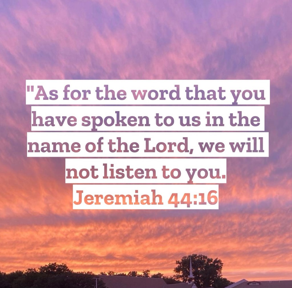 As for the word that you have spoken to us in the name of the Lord, we will not listen to you. Jeremiah 44:16 – If nothing else, we have to give it to the people of Judah for their honesty. There wasn’t any façade put on here, no pretending to be a follower of God anymore. They understood what Jeremiah was speaking to them were the words of the Lord, but they were choosing not to listen. They believed they had received far more blessing in their life when they worshipped idols than when they worshipped the Lord. In their opinion life was better and more plentiful when they served idols, and they were allowed to freely take part in the things they weren’t allowed to do under God’s rule. When Jeremiah then told them to turn to follow the Lord, their response was a flat no. The idols gave them more than God did, so why turn? Oh how deceived these people were. This is one of the enemy’s favorite plays, to cause us to believe we are finding more away from God than with God. It is true, away from the Lord we’ll be able to find more allowances to do all the things our fleshly desires want to do. Sin isn’t held back from us when we aren’t following the Lord, and it can appear that we are finding so much more in this life down that path. Yet those who’ve walked after sin long enough know what is found along that path is not freedom, plenty, and joy, but slavery, lack, and death. Know the deception that the people of Judah fell into is a deception the enemy is seeking to lead you into. His aim is to convince you that you will find more following him than following Jesus. Hear the truth and read the truth from scripture, only following the Lord will provide you with the life you truly desire. While the enemy offers momentary pleasure, Jesus offers eternal joy. I love you, but Jesus loves you more – Mac – Daily DEVO 3274