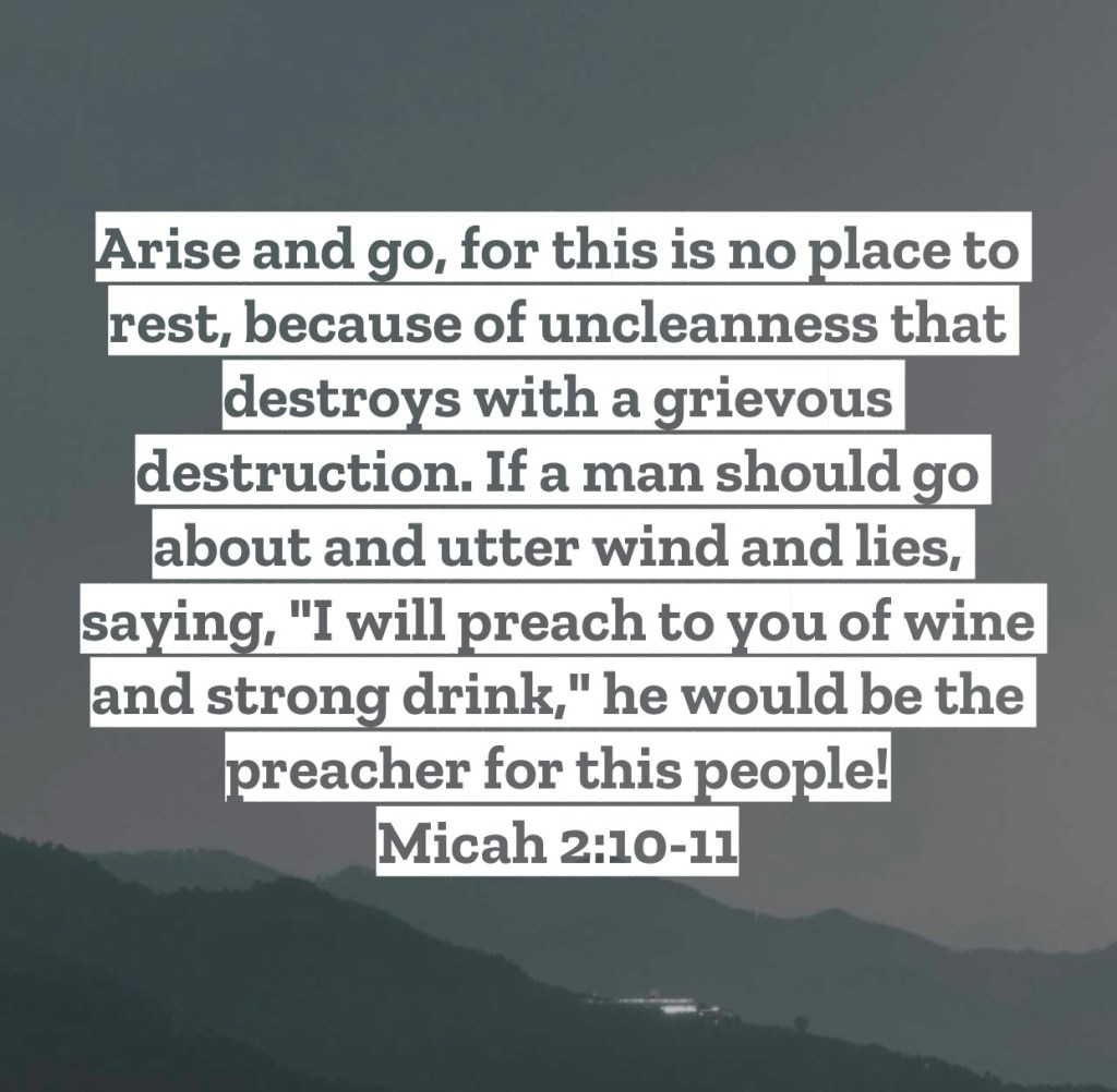Arise and go, for this is no place to rest, because of uncleanness that destroys with a grievous destruction. If a man should go about and utter wind and lies, saying, “I will preach to you of wine and strong drink,” he would be the preacher for this people! Micah 2:10-11 – Like many of the prophets, Micah had a hard ministry. It wasn’t till after around twenty years, and into the reign of the third King of Judah that Micah spoke to, that the people actually listened to his words. Instead the people and earlier kings listened to the words of false prophets telling them peace and rest was their future. Micah hints at the type of prophecies the other prophets told the people, prophecies of wine and strong drink flowing, ones of rest and no worry of enemies. Messages that said you don’t need to change your ways, the path you’re on is leading towards your enjoyment and blessing, keep on going as you are. Not surprisingly, the people chose to listen to those words over Micah’s words of repenting of their sin and following God. What should we do then in a world where God’s word is being set aside to listen to the messages being blasted loud in culture of “follow your heart,” “do what feels right to you,” “you don’t need to change, you are perfect exactly as you are?” We keep sharing the truth, that’s the only option we’ve been given by the Lord. We likely will run into opposition and we’ll likely not see the masses flock immediately to God’s word, but His words are true and the words that offer life. What is not going to help the world follow Jesus is the ones with the words of the Lord refusing to share it because it’s just too hard. The enemy is going to constantly preach his message, we need then to never rest in our proclaiming of God’s message. I love you, but Jesus loves you more – Mac – Daily DEVO 3304