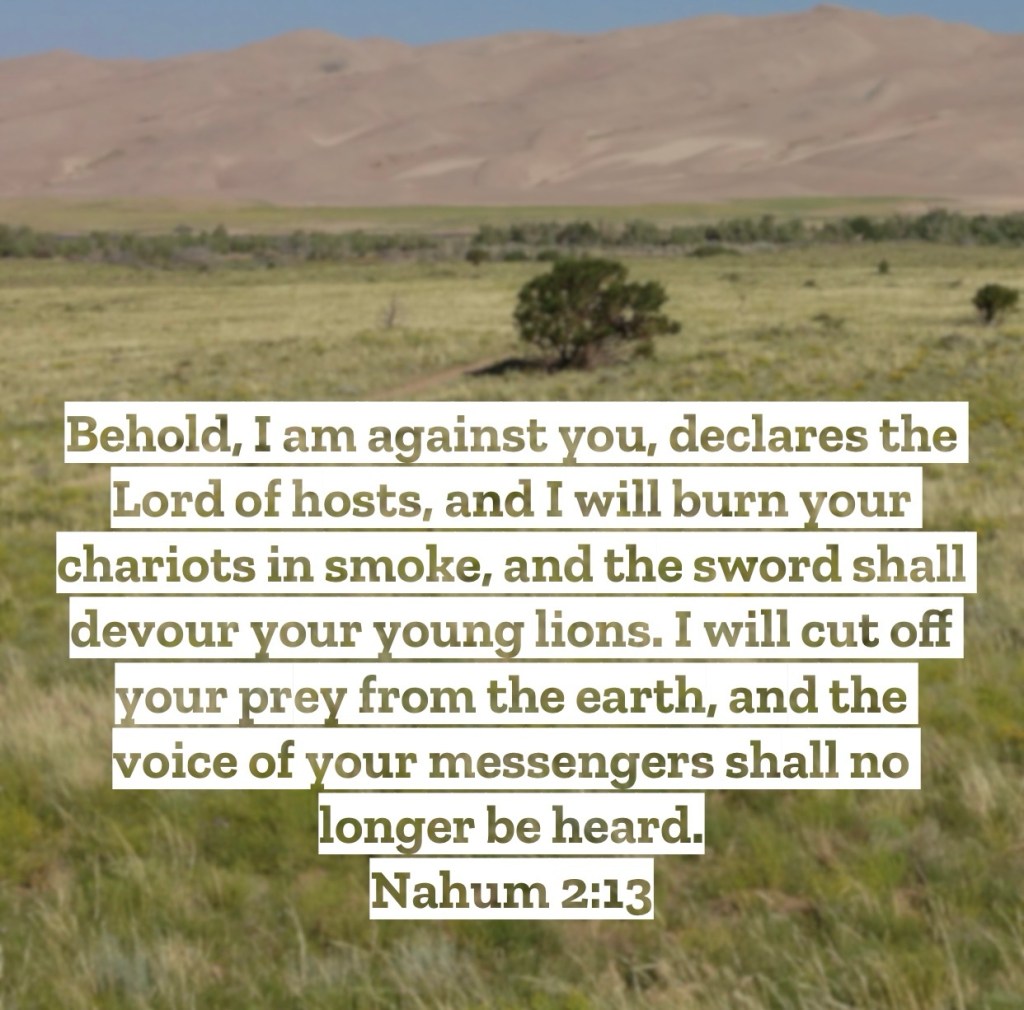 Behold, I am against you, declares the Lord of hosts, and I will burn yourchariots in smoke, and the sword shall devour your young lions. I will cut off your prey from the earth, and the voice of your messengers shall no longer be heard. Nahum 2:13 – No one on earth should desire such a message like this to be spoken to them from the Lord. See the gravity of what is being said here by the Lord…He Himself was against Ninevah. Their refusal to turn from their sin and the evil that they had spread was to come to an end and the Lord Himself was to be the Judge and Deliverer of judgement. Now such words would never be said by the Lord today…right? The Lord would never say He is against anyone like He said here in Nahum’s day, right? Know the Lord’s posture towards Ninevah will be the same posture for even those today that reject Him. Their version of chariots and swords will not stop the coming judgement of the Lord on their sin. No battle they fight against God will win. No gold or silver will be enough to pay off God from bringing down His wrath on their sin. No power or prestige they have will sway the Lord from executing His judgement. God is faithful and just to condemn sin, and if they refuse to turn from their sin then they will face God’s condemnation. BUT…that isn’t the only option! God’s grace and forgiveness is readily available to be shown to those who repent of their sin. Even evil Ninevah themselves saw that when they repented of their sin God was willing to relent from the destruction He was bringing and offer salvation instead. We who are carriers of the good news today must not sugar coat the reality of what is to come for those who reject God’s grace. The truth is that God is against those who reject His grace. He loves them and desires them to be with Him, but His wrath is against those who do not accept His offer of forgiveness. Be about sharing the truth and the grace of Jesus. I love you, but Jesus loves you more – Mac – Daily DEVO 3311