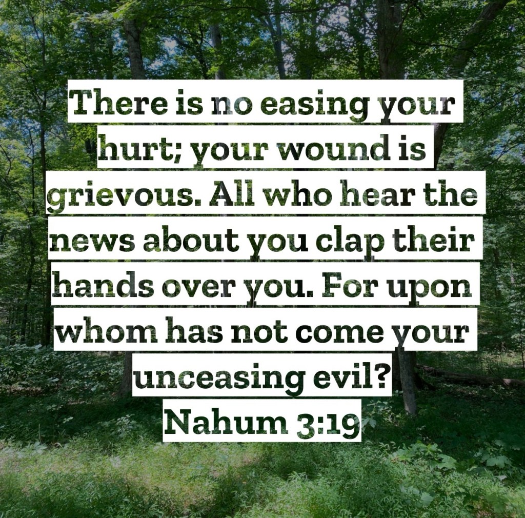 There is no easing your hurt; your wound is grievous. All who hear the news about you clap their hands over you. For upon whom has not come your unceasing evil? Nahum 3:19 – The prophet is continuing his words against the sinful Ninevah. Their evil had stretched far and wide, influencing nations to follow their evil ways and crushing nations under their oppressive grip. Truly the horrors done by Ninevah were shocking, yet to them such things weren’t horrors but things to boast about. So many had come under Ninevah’s unceasing evil. While it can be tempting to relish in the destruction of such an evil people, let’s not forget that’s exactly where Jonah was at with Ninevah years prior, and we look at his posture as obviously sinful. Jonah despised the fact that God’s grace and steadfast love was shown to such a people, for he longed for Ninevah to burn like Sodom and Gomorrah. Yet we look at Jonah, sitting and angry over a people being shown grace, as foolish and unholy. Let us not then sit wishing the fires of judgement to come upon the people that God is seeking to show His grace to. Yes, these people may have hurt us or hurt the ones we love. Yes they may have said horrible things, done horrible things, and been horrible people, but our posture ought to not desire their condemnation but their redemption. Their evil may have touched so many people, but God’s love can still touch them…and maybe God wants to do that through you. Remember the grace you’ve been shown and be willing to extend that to those who need God’s grace the most. I love you, but Jesus loves you more – Mac – Daily DEVO 3312
