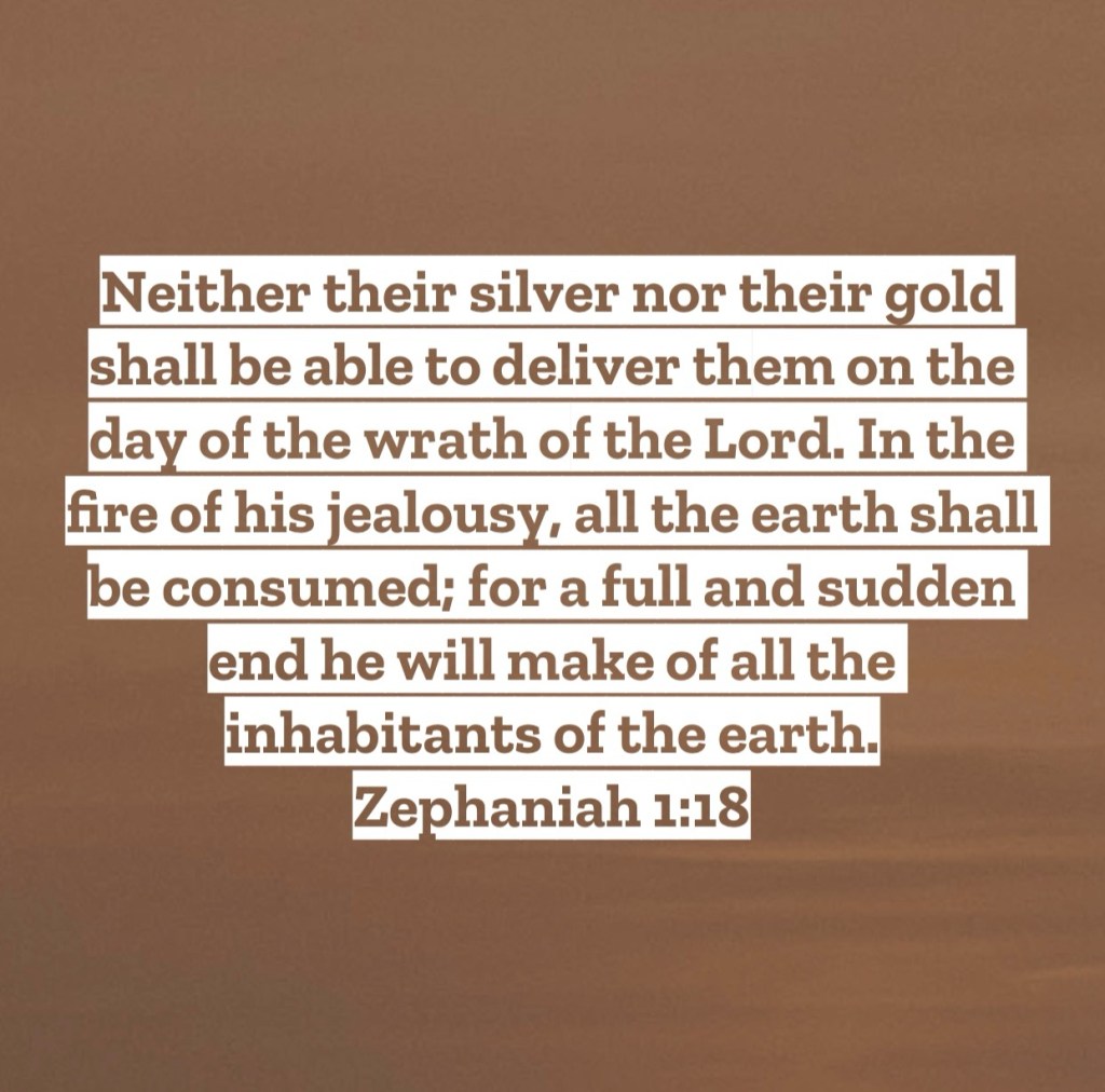 Neither their silver nor their gold shall be able to deliver them on the day of the wrath of the Lord. In the fire of his jealousy, all the earth shall be consumed; for a full and sudden end he will make of all the inhabitants of the earth. Zephaniah 1:18 – With it being the Christmas season, we’ve recently watched the classic Christmas movie Rudolph. In it there is a song that goes like this, “Silver and gold, Silver and gold, everyone wishes for silver and gold. How do you measure its worth? Just by the pleasure it gives here on Earth.” Here in our chapter we have the Lord seeing the silver and gold idols that His people had chosen to worship over Himself. Israel had chosen to imitate the nations around them and begin to worship their gods of silver and gold, and yes, this did give them pleasure on Earth like the song spoke about. Yet the Lord was making it clear to His people, worshiping these gods of silver and gold and devoting yourselves to the pleasure you find having them in your life is not going to bring everlasting joy but the wrath of the Lord. Today as I write this devotion, its Christmas morning. While a chapter of prophecy around God’s wrath is not the way I expected to start my Christmas morning, it is good for us to see that the “silver and gold” of the world shouldn’t be what we make our lives about, nor Christmas about. As God was calling His people to do in this chapter, let us as well set aside the silver and gold to make our lives about the Lord instead. And how to you measure the worth of the Lord? An impossible task, but what greater pleasure can we find than the truth that He sent His Son so we could be with Him. Merry Christmas! I love you, but Jesus loves you more – Mac – Daily DEVO 3316