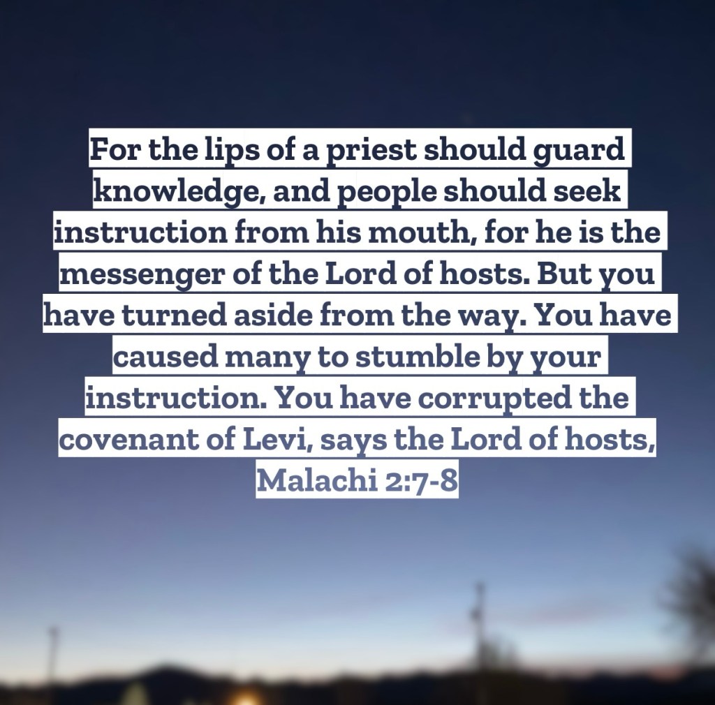For the lips of a priest should guard knowledge, and peopleshould seek instruction from his mouth, for he is the messenger of the Lord of hosts. 8 But you have turned aside from the way. You have caused many to stumble by your instruction. You have corrupted the covenant of Levi, says the Lord of hosts… Malachi 2:7-8 – In speaking with the corrupt priests of Malachi’s day, the Lord calls them to look back at the life of Levi, the original tribal leader of the priests. Levi faithfully held the office according to the Lord. He walked in uprightness, turned people from their sin, and was a guide to those seeking godly instruction. Yet compared to this example the priests Malachi’s words to were evil, neglecting their duties as priests and being unfaithful husbands. As readers of this chapter we are being challenged by seeing the right and wrong ways those who carry the label of servant of God should live. Like Levi our heart should desire others to walk after the Lord. True words of the Lord should be heard from us and the relationships the Lord has given us should be valued by us too. Here the Lord is reminding these priests how special that title is that they carry. Know for us, carrying the title of God’s disciple and God’s child is a truly special thing too that we shouldn’t dismiss as nothing. Remember who you are in Christ and live in such a way that glorifies the Lord. Live in such a way that just as God used the example of Levi to demonstrate to others what a faithful life looks like, God could use your story too. I love you, but Jesus loves you more – Mac – Daily DEVO 3320