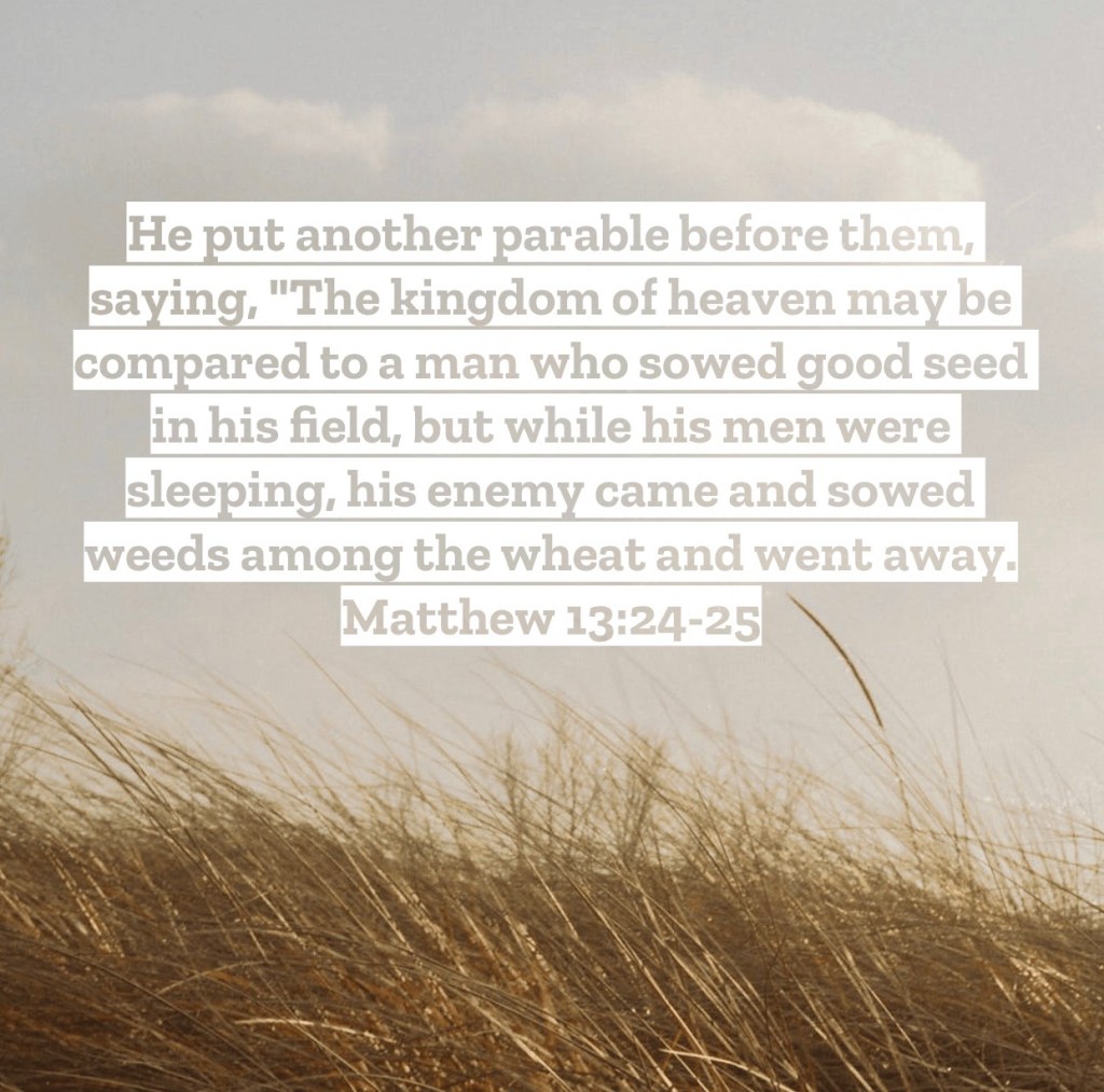 He put another parable before them, saying, “The kingdom of heaven may be compared to a man who sowed good seed in his field, 25 but while his men were sleeping, his enemy came and sowed weeds among the wheat and went away. Matthew 13:24-25 – We have an enemy wanting to ruin what God is doing within our life and within the church. Often we simply need a reminder of this for we can get comfortable and complacent, not even noticing the sly work of the enemy in our life. Here Jesus is talking about how in the kingdom that He is setting up, where God is King and all His followers submit to God’s authority, that the enemy is going to sneak in and also add his part. Here the enemy’s addition was “weeds” among the wheat. Later we see birds, which we learn from earlier parables were sent my satan to remove good seed, landing and making nests in the tall mustard plant. Another parable shows how a woman came and hid leaven, which was often connected to sin in the Bible, into flour to affect the whole batch. Whether weeds, birds, or leaven, all are illustrations Jesus gave to open our eyes to the reality of satan’s work within the work God is doing. God plants, satan spreads weeds. God grows, satan nests where he shouldn’t. God creates, satan mixes in the wrong ingredients. Let us take note of this warning from the Lord. Embrace the wonderful growth God is seeking to foster within your life, but be aware that where God works so will the enemy seek to work in his weeds. The enemy can’t stop God and will never be completely victorious in all his efforts, but anyway he can disrupt the holy work of the Lord in our life or the church he will. Be aware of this and don’t give the enemy even a crack to place his seeds in. The only growth that we should see in our life is the wheat of the Lord, not the weeds of the enemy. I love you, but Jesus loves you more – Mac – Daily DEVO 3335