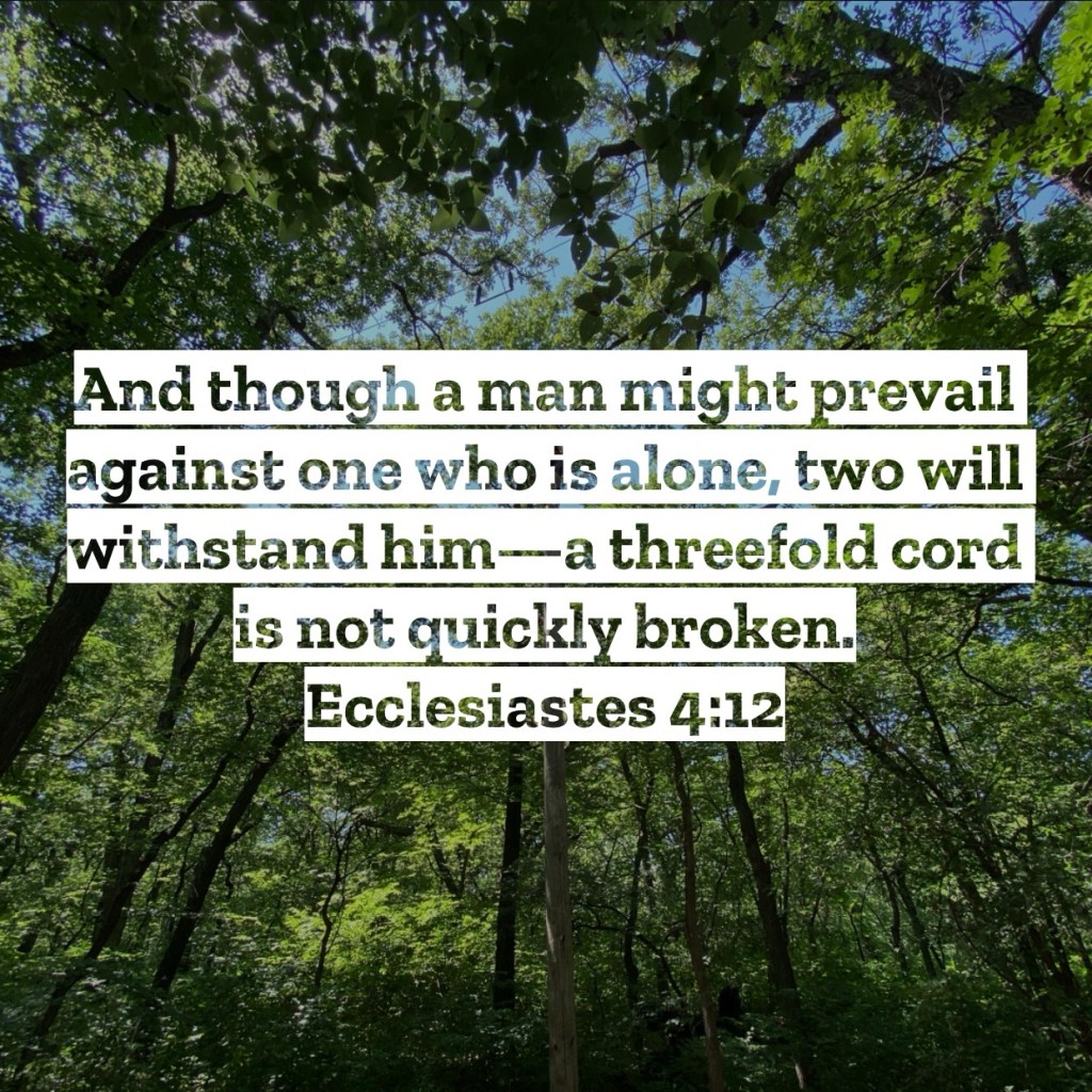 And though a man might prevail against one who is alone, two will withstand him—a threefold cord is not quickly broken. Ecclesiastes 4:12 – Solomon in his pursuit of purpose and the point of this life notices an injustice taking place. He witnessed oppression taking place against people and seemingly no help ever coming their way. This fueled his mindset that life is pointless for if injustices like this were allowed and never handled it would be better to have never lived at all. Yet Solomon did take note that for those who did live that it was better to live in this life together. Whether we fell down or it was cold at night, existing in this “pointless” existence at least was far better when done together. Here Solomon is spot on, minus the whole pointless part! Life is designed to be done together, especially for us who follow Jesus. We were created to be supported and to support our brothers and sisters in Christ. That support system is called the church and it is one of the most precious gifts the Lord has given us. Yet we also see Solomon speak of a “threefold cord,” a third rope woven into the mix of support. While unsure exactly what Solomon meant by this third rope, we see this as showing the importance of weaving God into this structure of support. When a life wraps itself around the Lord there is not only support found, but the help in life’s oppressions, and even the purpose of our lives. God designed us to do life with other believers and designed us to do life with Him. Don’t be surprised then when you feel weak in the seasons you are trying to do life alone, you were never created to do life that way. Find your people, find time with the Lord, and find security in the support that this threefold cord brings you in this life. I love you, but Jesus loves you more – Mac – Daily DEVO 3389