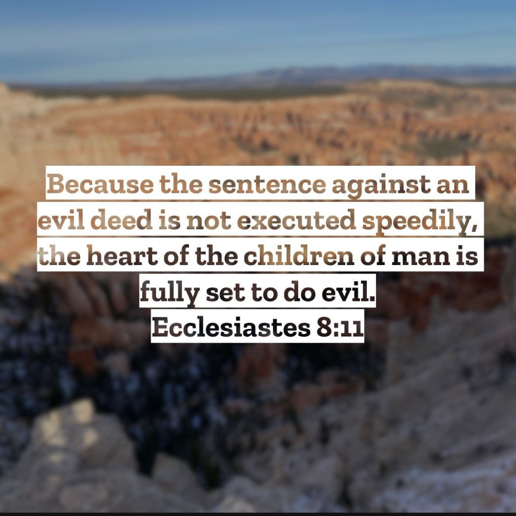 Because the sentence against an evil deed is not executed speedily, the heart of the children of man is fully set to do evil. Ecclesiastes 8:11 – Solomon noticed a seriously concerning issue within this life. Those who do wicked things often don’t see the consequences for their action immediately. Maybe it’s something seemingly simple like a small lie, yet this plays itself out with much larger crimes as well. The wicked do there deed and it seems like they get away with it for there is no immediate consequence. This then causes them to continue to do wrong, settling their heart to only do evil as our verse says, for there is no consequence to their actions. Certainly if all there was to this life was this life, and in that life wickedness was left without consequences, then Solomon’s stance that life is meaningless makes a lot of sense. Yet as we’ve stated all along in our study of Ecclesiastes, this life isn’t all there is. There is eternity after this life and what we do in this life matters even in eternity. A life of wickedness may seem to get away with their actions in this life, but in the life to come their future is eternal punishment. Know that while wickedness may not see rightful punishment in this life and it sadly may even find reward in this world, the blessing and reward they experience in this life is the closest to Heaven they’ll ever see. Be willing to pray for those caught in that vile cycle of unpunished wickedness to have their eyes opened to the eternal aspect of life and that there needs to be a change in their life if they ever want to see Heaven someday. I love you, but Jesus loves you more – Mac – Daily DEVO 3393
