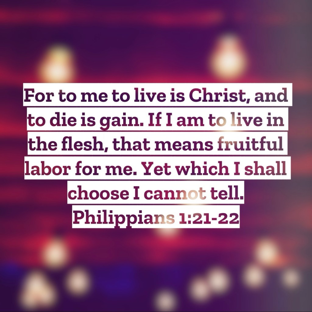 For to me to live is Christ, and to die is gain. If I am to live in the flesh, that means fruitful labor for me. Yet which I shall choose I cannot tell. Philippians 1:22-23 – While not a conversation you’d think you’d have with the Apostle Paul, here he clearly says he isn’t sure which he’d rather have right now, life or death. Understand this isn’t coming from a place of depression, but a from a place of true understanding of the life to come. Paul knew what was ahead from him and it would be a gain in his life no matter how blessed this earthly life might be for him. His future was Heaven with the God that he so faithfully followed and served. Yet if now wasn’t the time to be there with the Lord, then he would remain in this life yet with a sole purpose. To live for Christ. If he was to remain living then the only option was fruitful labor for the Gospel. What a mindset for us believers to have! Death should not be something we fear for it truly is only going to be a gain for us. Eternal paradise with the Lord! Yet, if today isn’t our day to go to our heavenly home, then we live for Christ. We live with the determination to be fruitful for the Lord. If God has placed breath in our lungs than that breath is to be given out in worship of Him. If God has given us another day to live, than this day ought to be used for His purposes alone. If we’re living, we’re living for Christ. What changes then would need to be made in your life for such a statement to be true? Cherish the breath and day you have been given, and now give it back to the Lord. I love you, but Jesus loves you more – Mac – Daily DEVO 3416